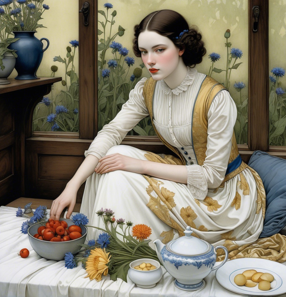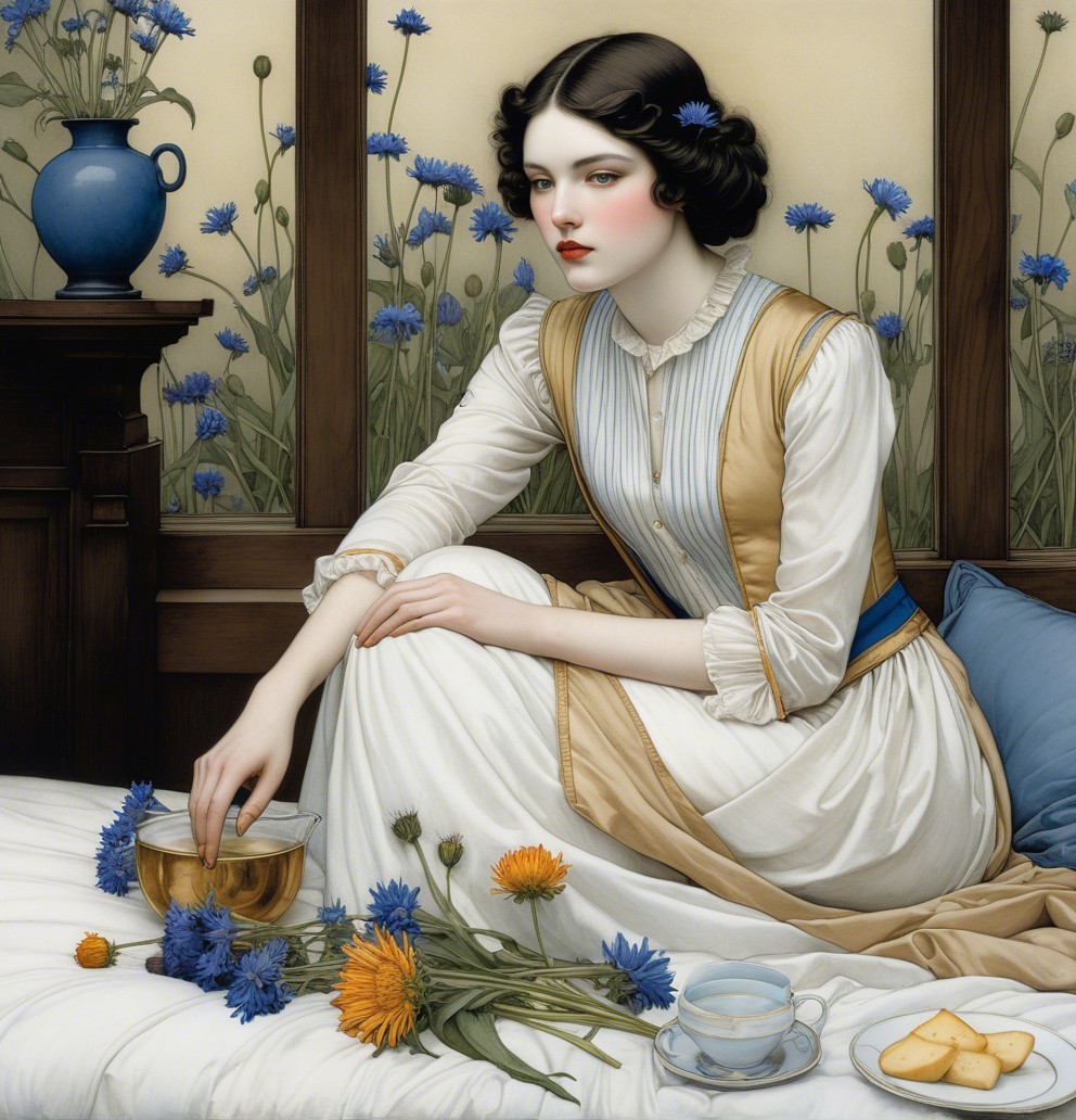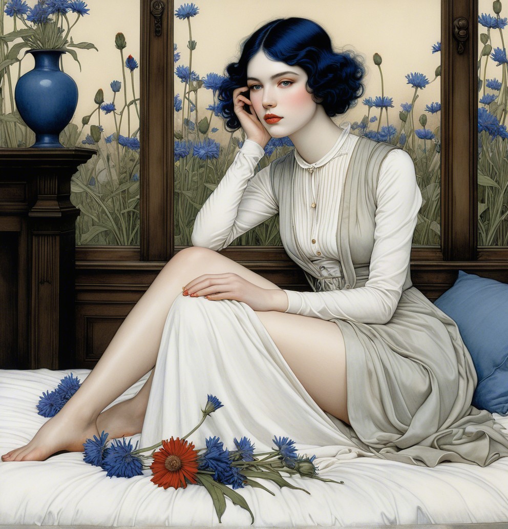 A serene woman with blue curly hair sits gracefully on a bed, surrounded by wildflowers. Her white dress contrasts softly with the vibrant blue blooms in the peaceful, sunlit scene.