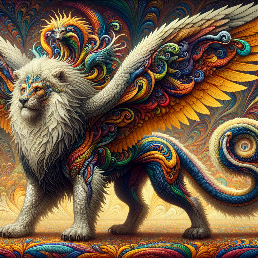 A chimaera with the body of a bear with the wings of an eagle and the head of a direwolf with lion manes that are made of snakes like Medusa's hair and with tiger legs, the creature is based on a griffin. The style is psychedelic with multi faceted background in bright colours