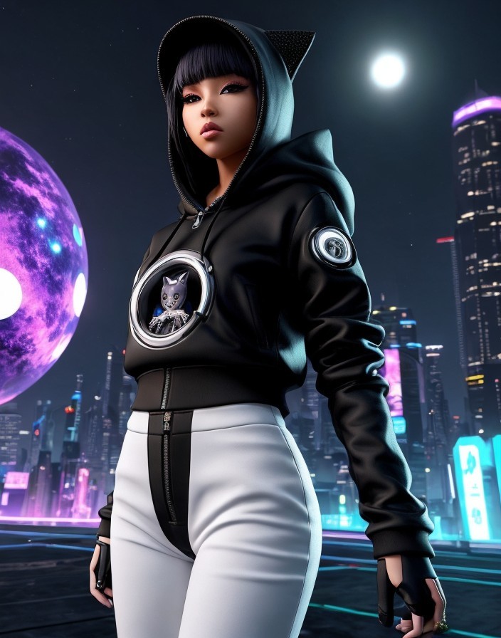A stylized young woman with a cat-eared hoodie stands confidently in a neon-lit futuristic cityscape at night.