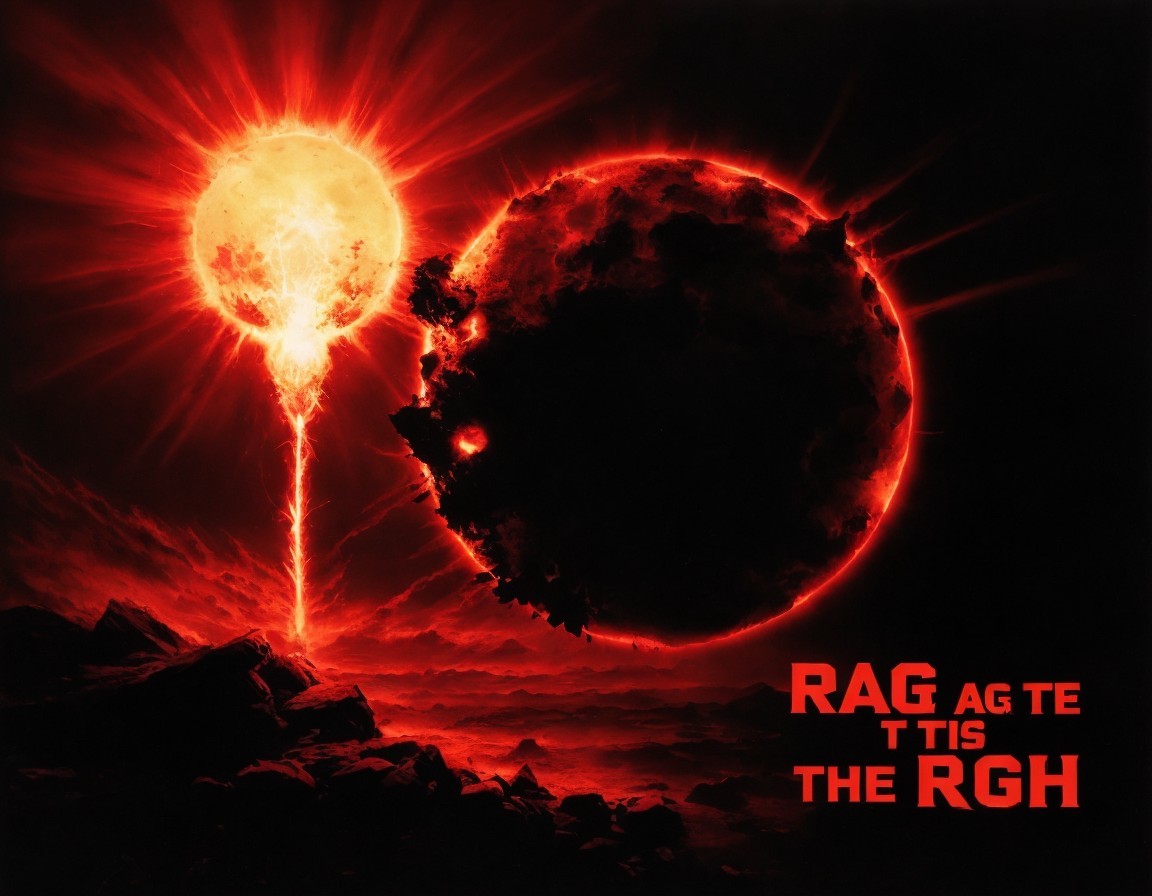 An apocalyptic scene with a fiery explosion behind dark clouds, lightning, and dramatic red hues with bold text overlay . (Dylan Thomas)