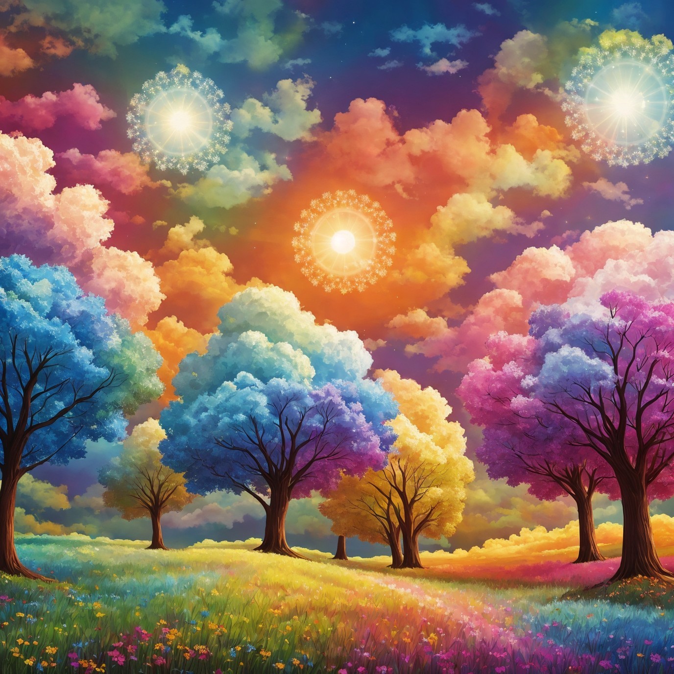A vivid landscape with colorful, fantastical trees under a sky with bright clouds and sparkling stars or suns.