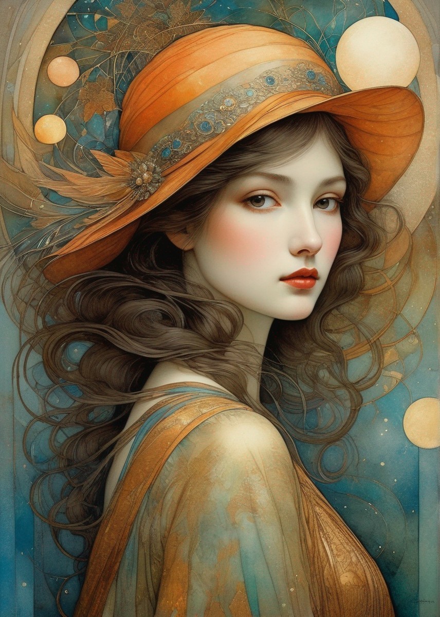 Portrait of woman with pale skin, dark hair, feather headdress, beads, and earrings