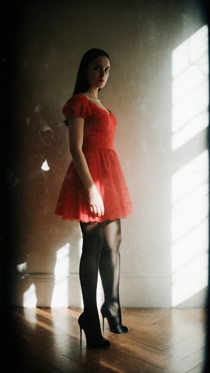 A young woman stands confidently in a red dress with puffed sleeves, paired with black tights and high heels. Soft sunlight streams through a nearby window, creating a dramatic ambiance.