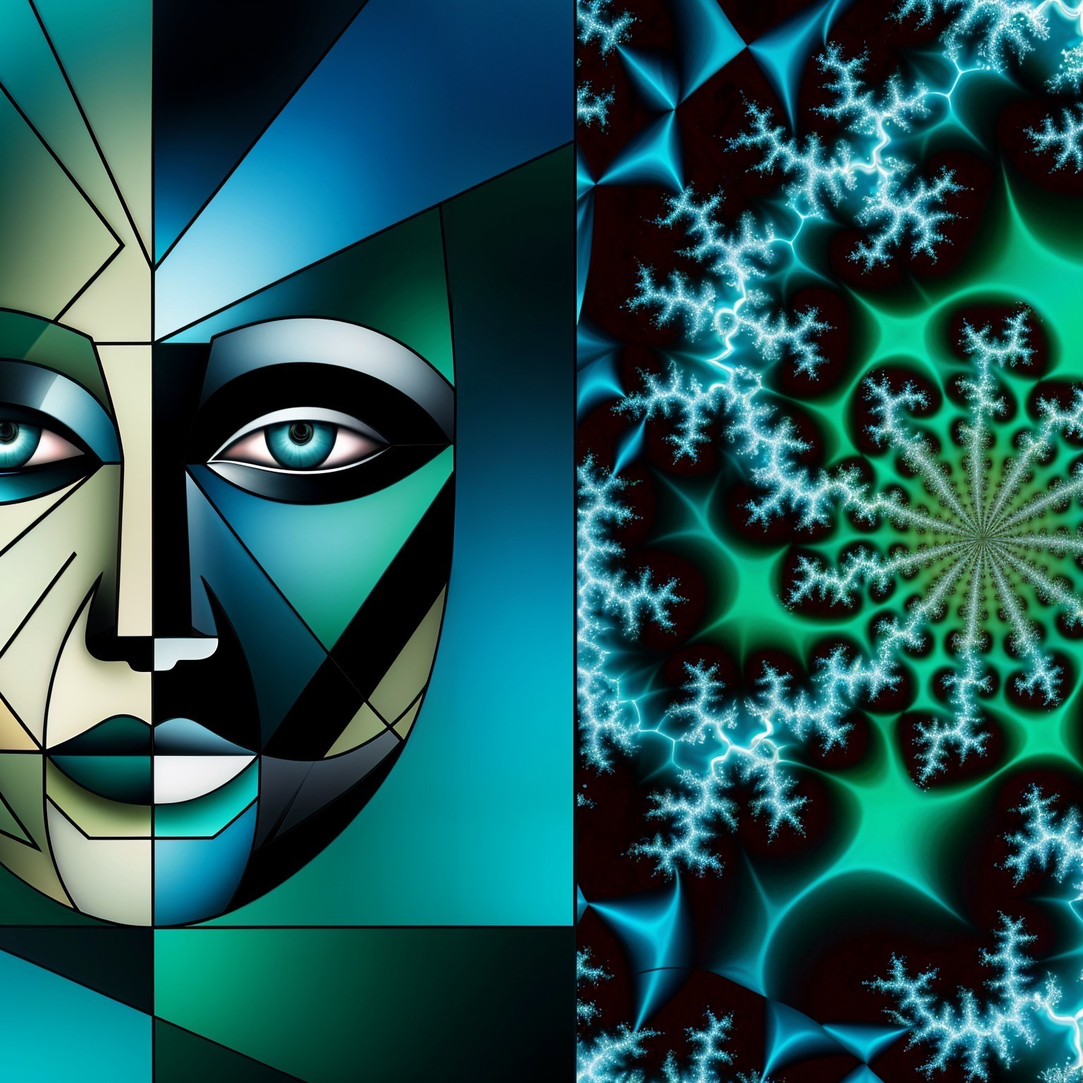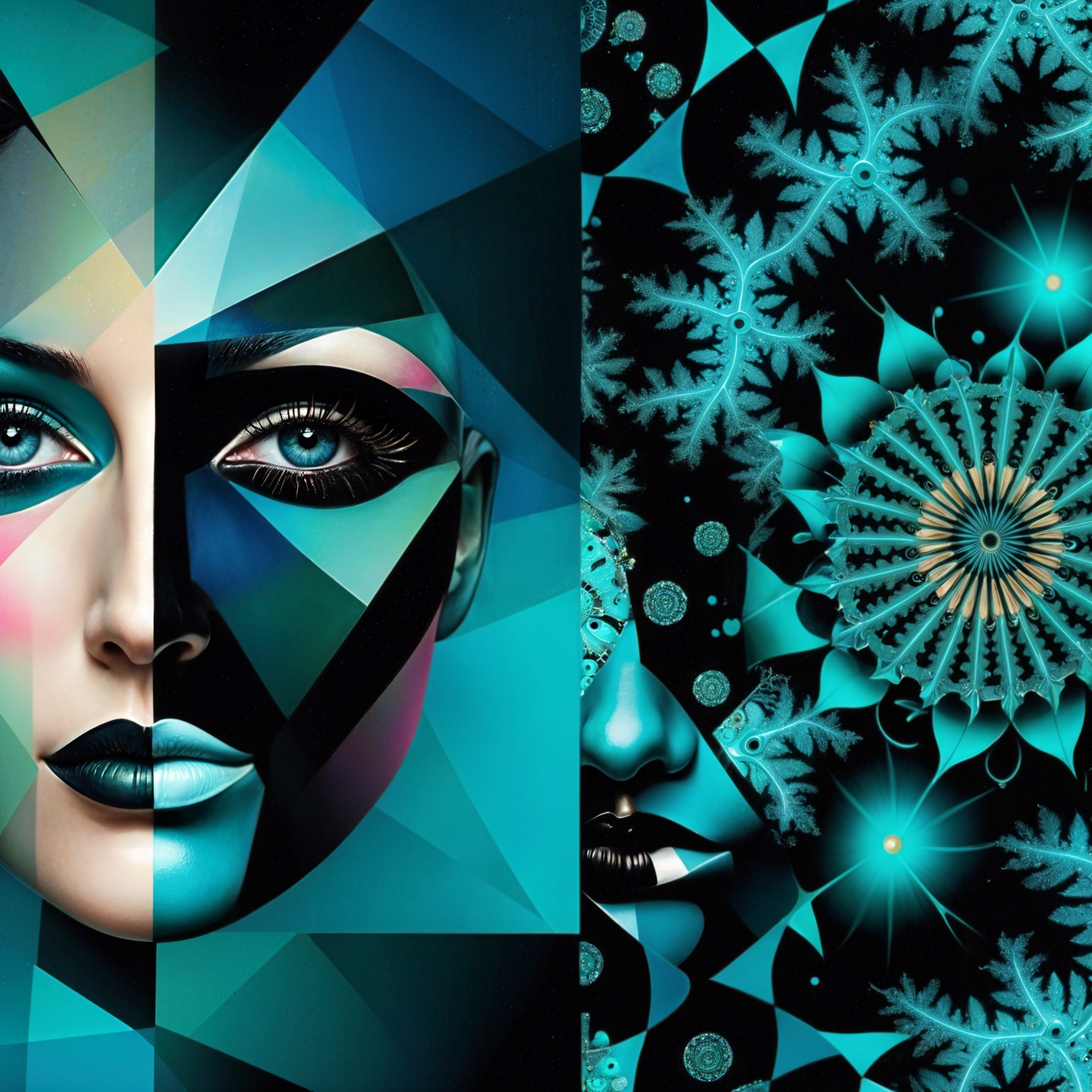 The image features a striking abstract artwork of two stylized female faces, split by geometric patterns in turquoise and pink surrounded *