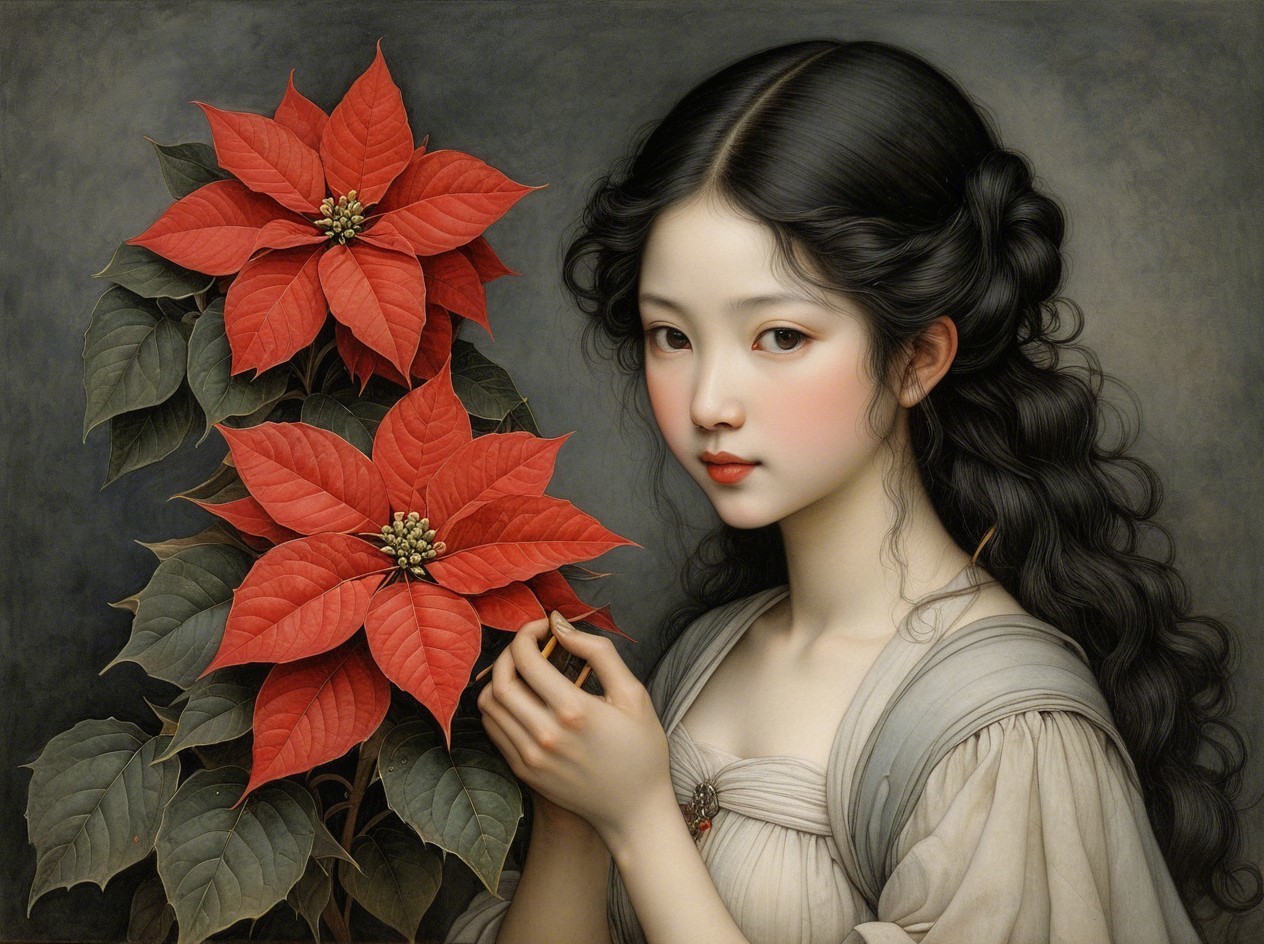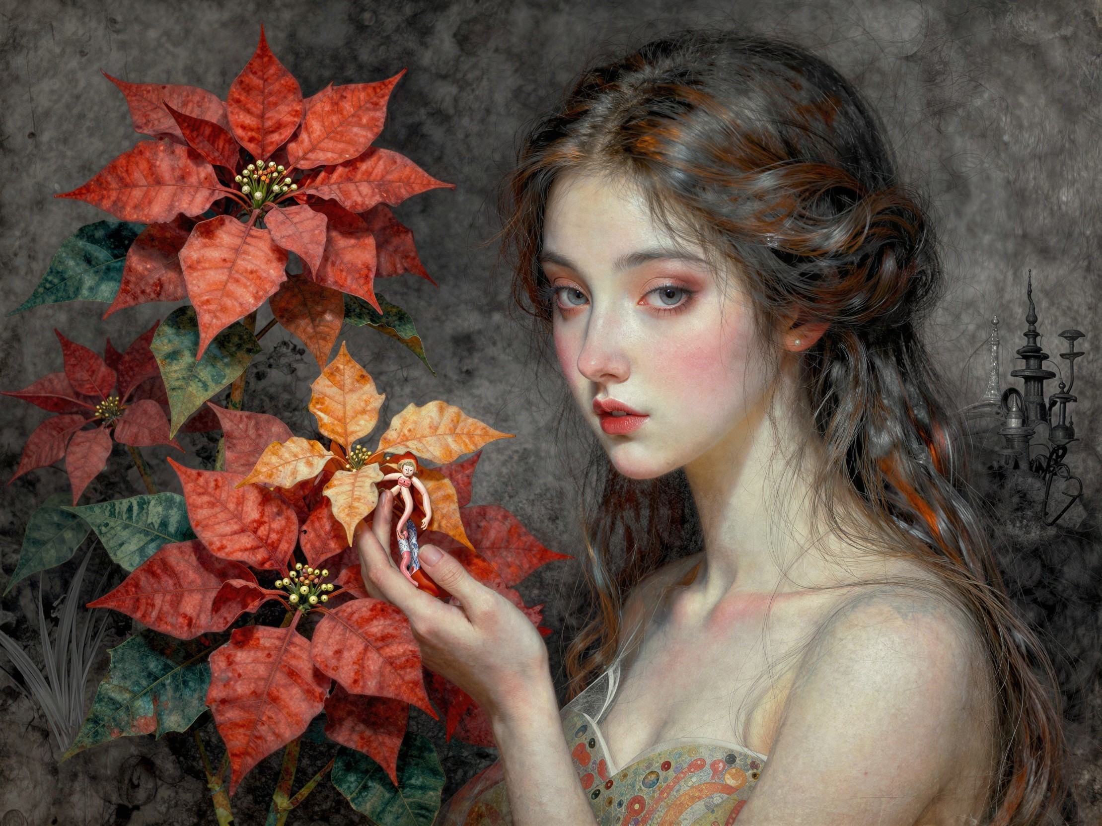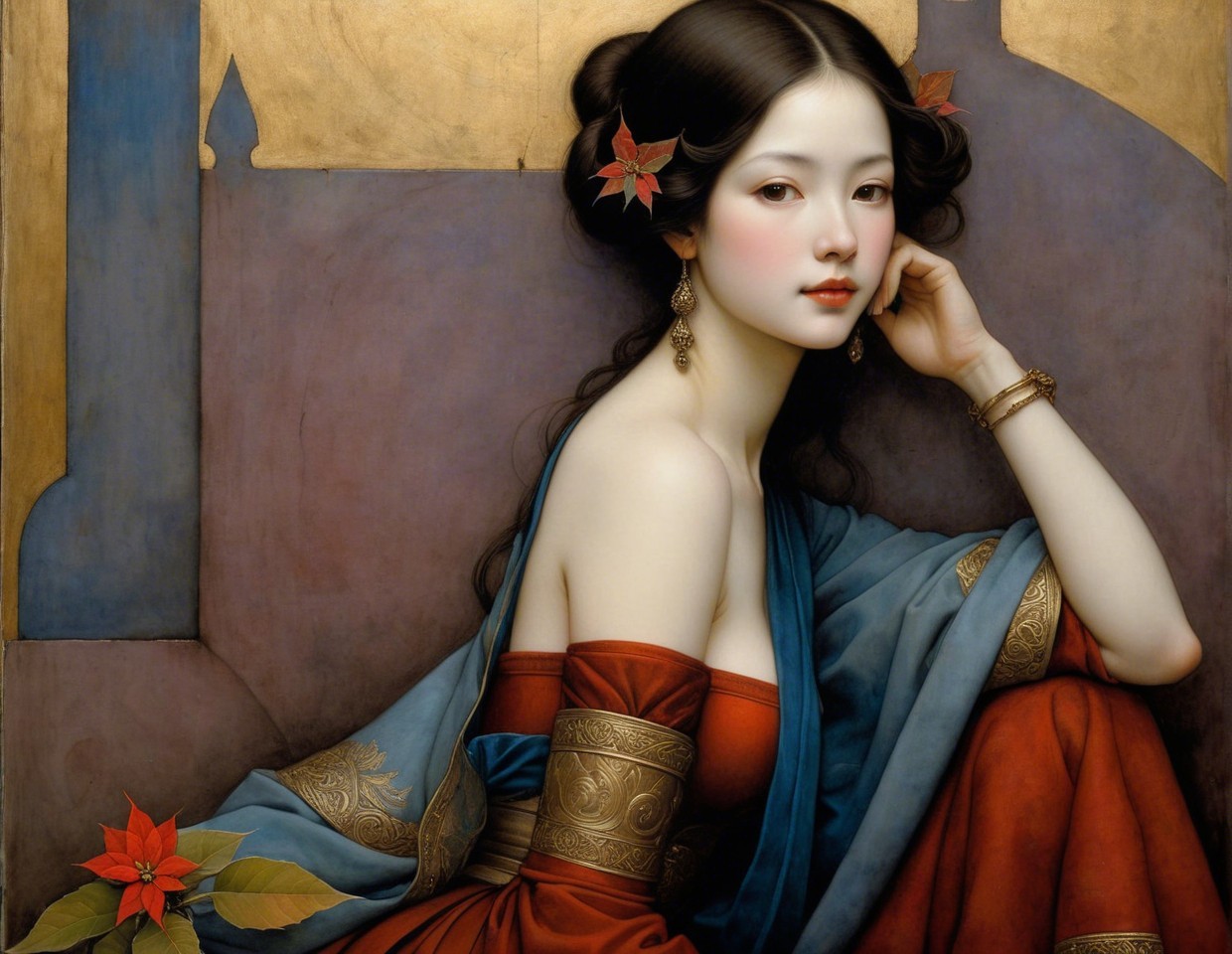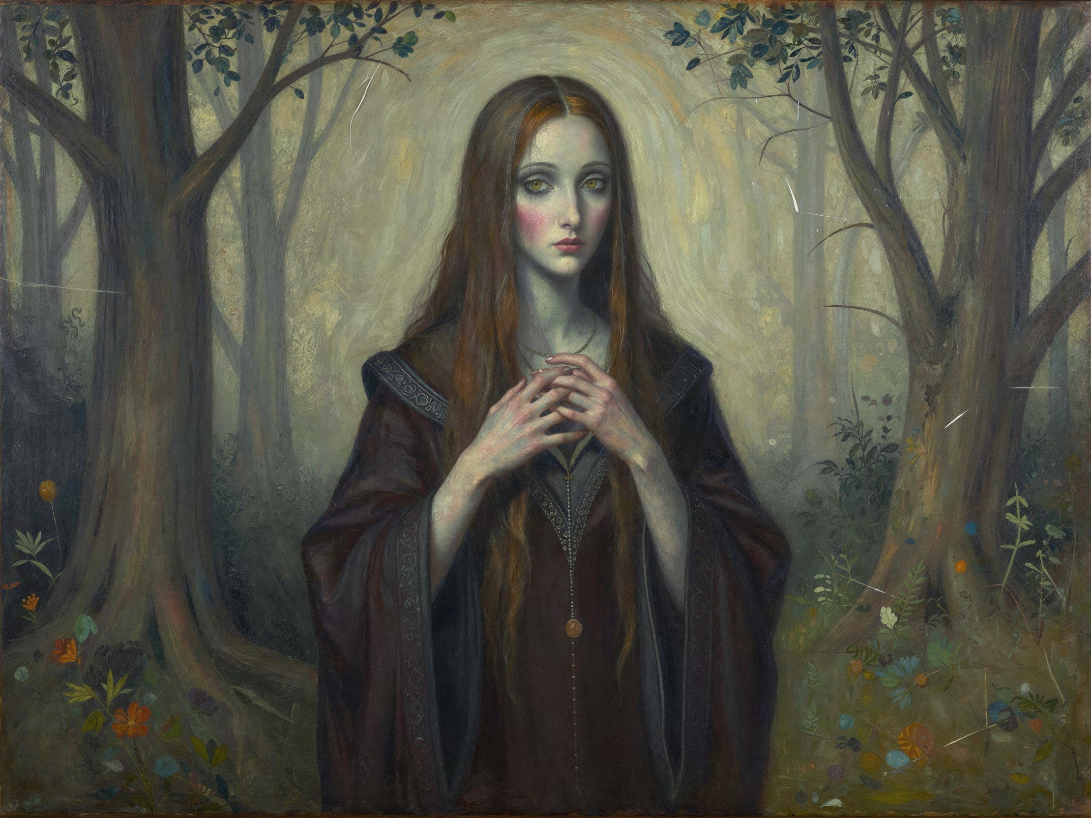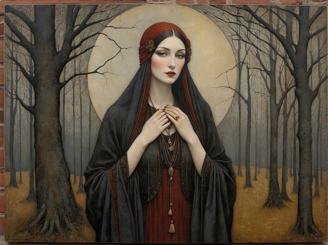 A captivating oil painting depicts a pale woman with dark hair in a red head scarf adorned with metallic flowers, a dark cloak, and a burgundy dress, standing in a barren forest. She wears multiple ornate necklaces and a ring, with her hands clasped. Behind her, a full moon glows against the