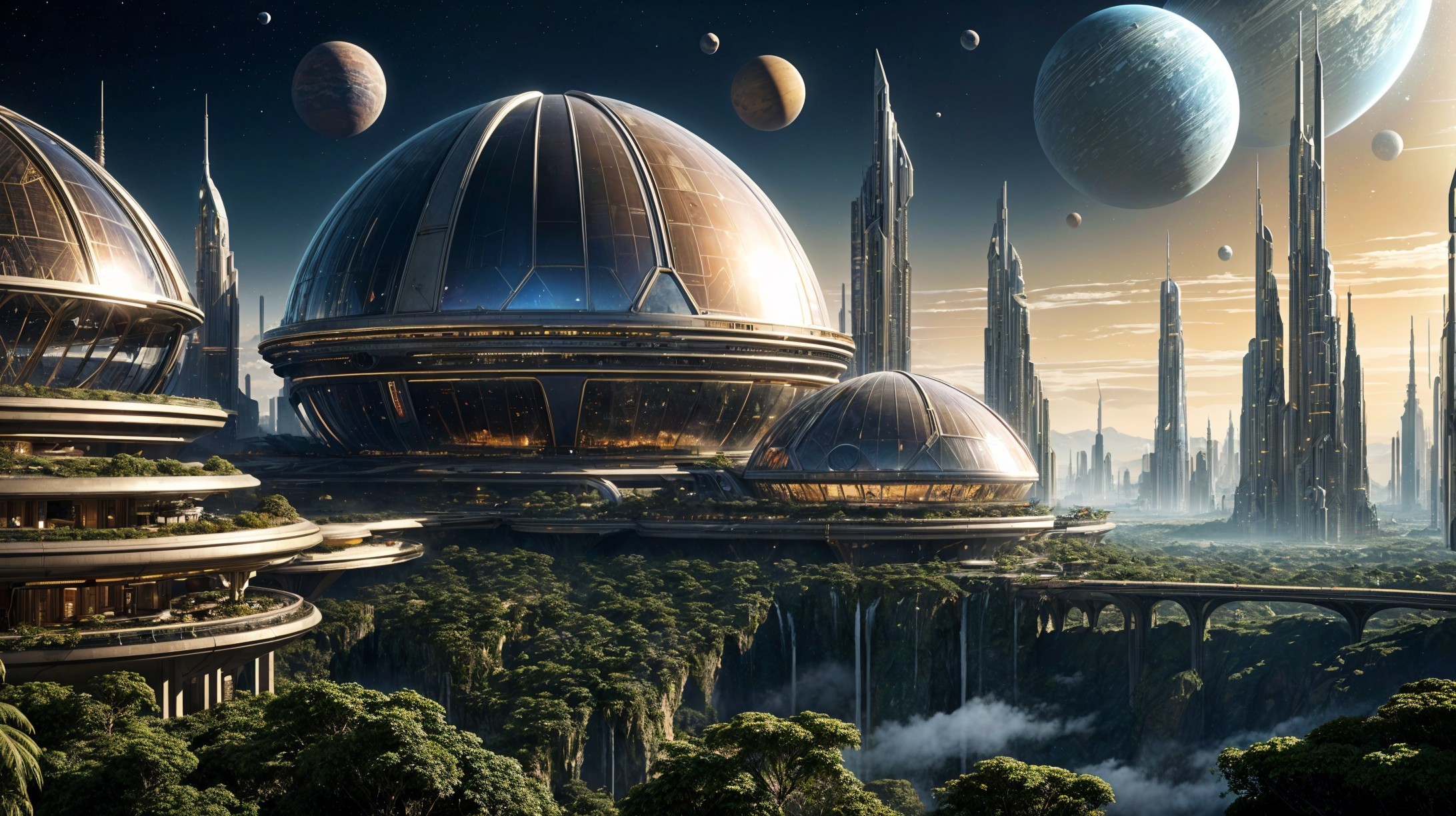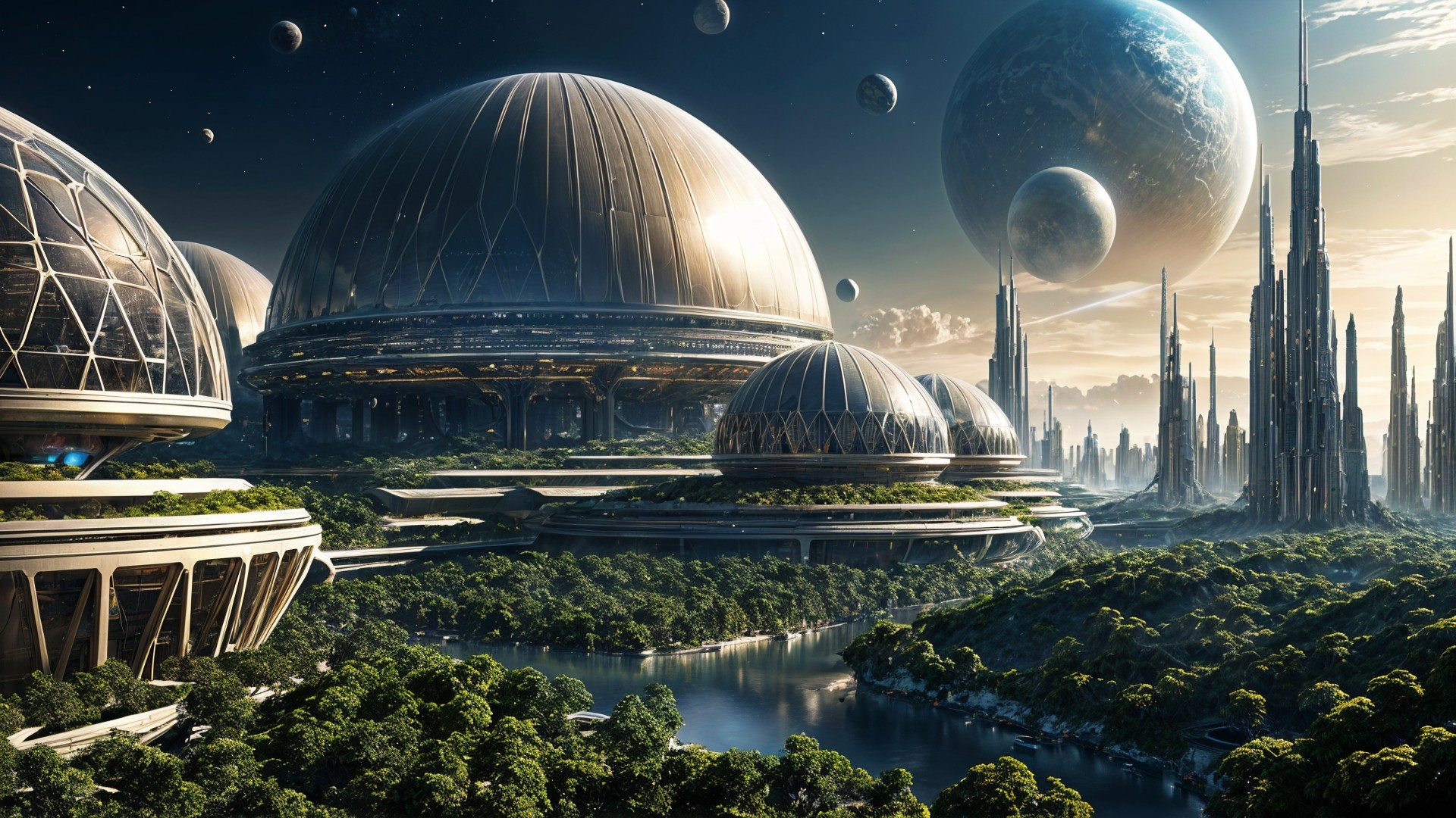 A breathtaking futuristic cityscape features large, dome-shaped structures with metallic surfaces, set against a backdrop of distant planets and a mountainous landscape, showcasing advanced architecture and technology.