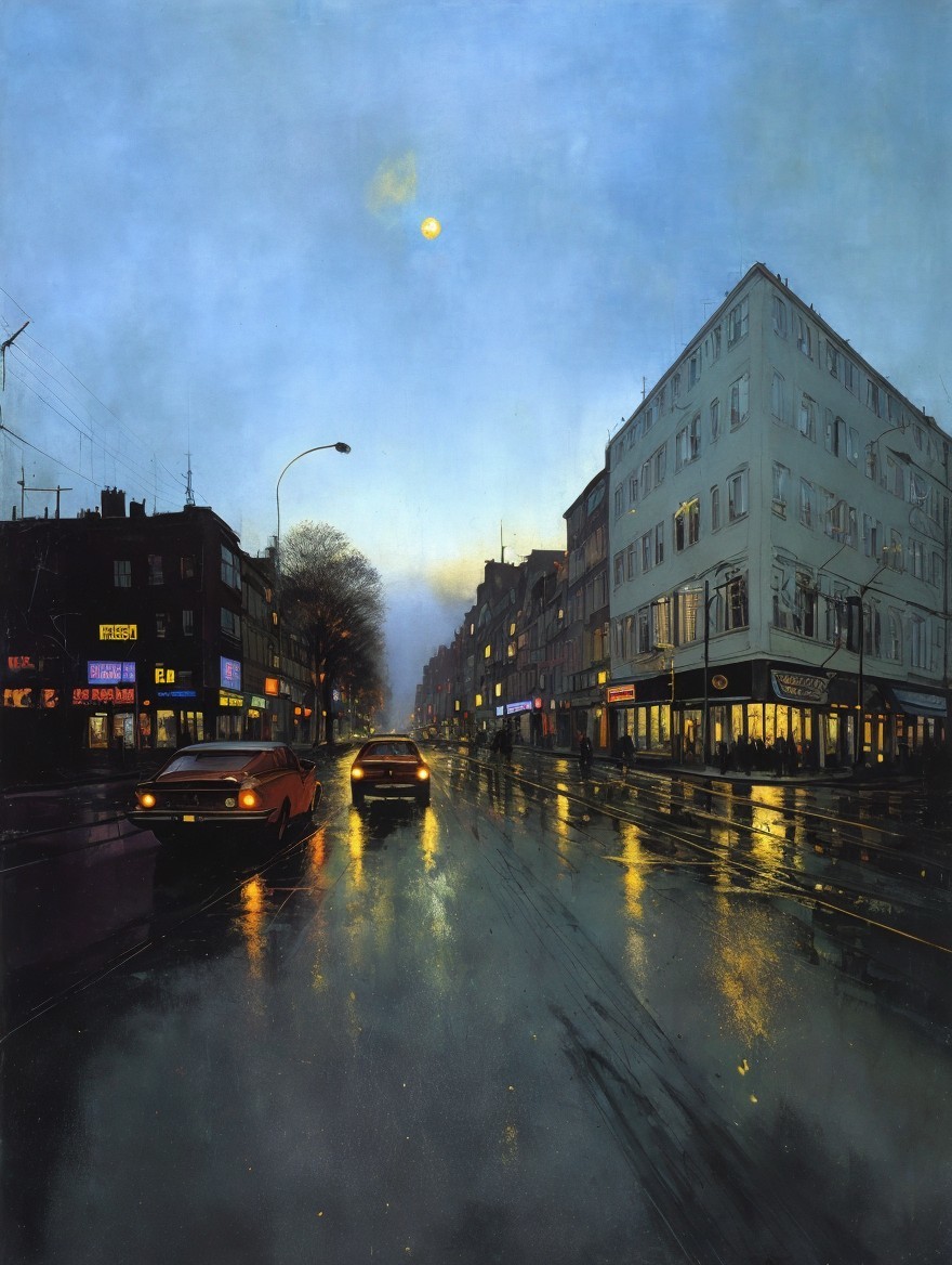 A city street at dusk, with wet pavement reflecting streetlights and the moon. Dimly lit buildings line the road, while classic cars navigate through the quiet, atmospheric scene.
