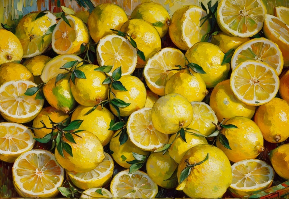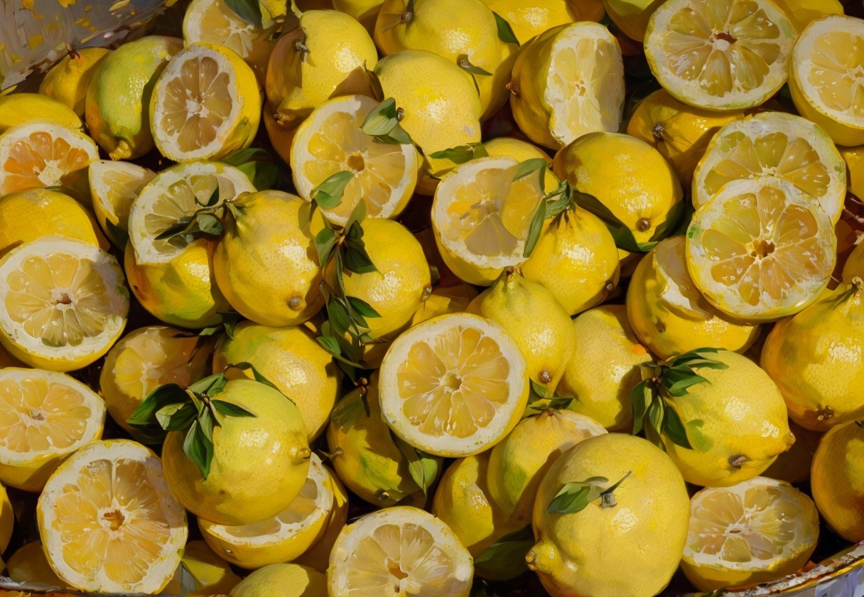 Vibrant Lemon Display with Green Leaves and Warm Background