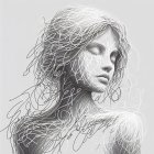 The image features a stylized portrait of a woman with intricately flowing hair and soft features, rendered in a minimalistic, monochromatic line art style against a light background.