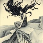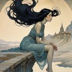Woman with Long flying black Hair, sitting on edge, stardust, Style: Möbius, Daniel Merriam, Egon Schiele, Alphonse Mucha, Anna Dittman, illustration