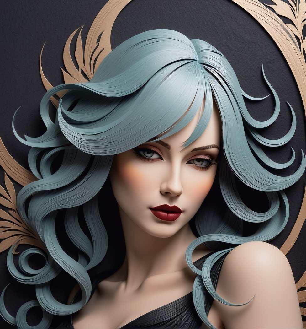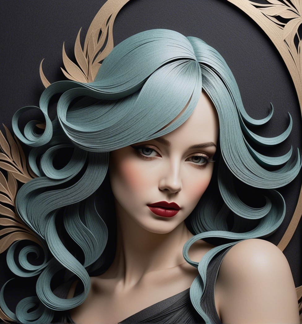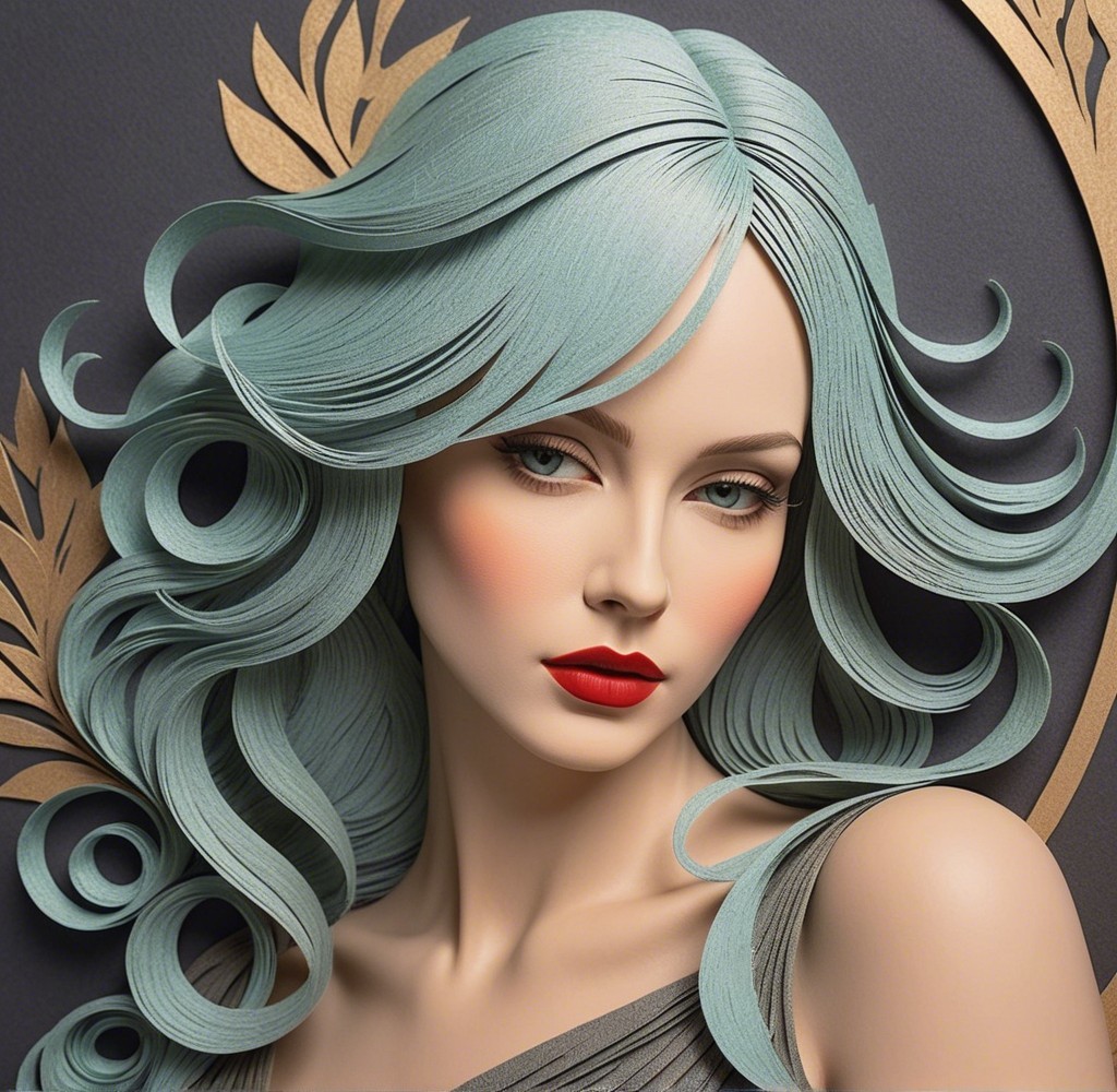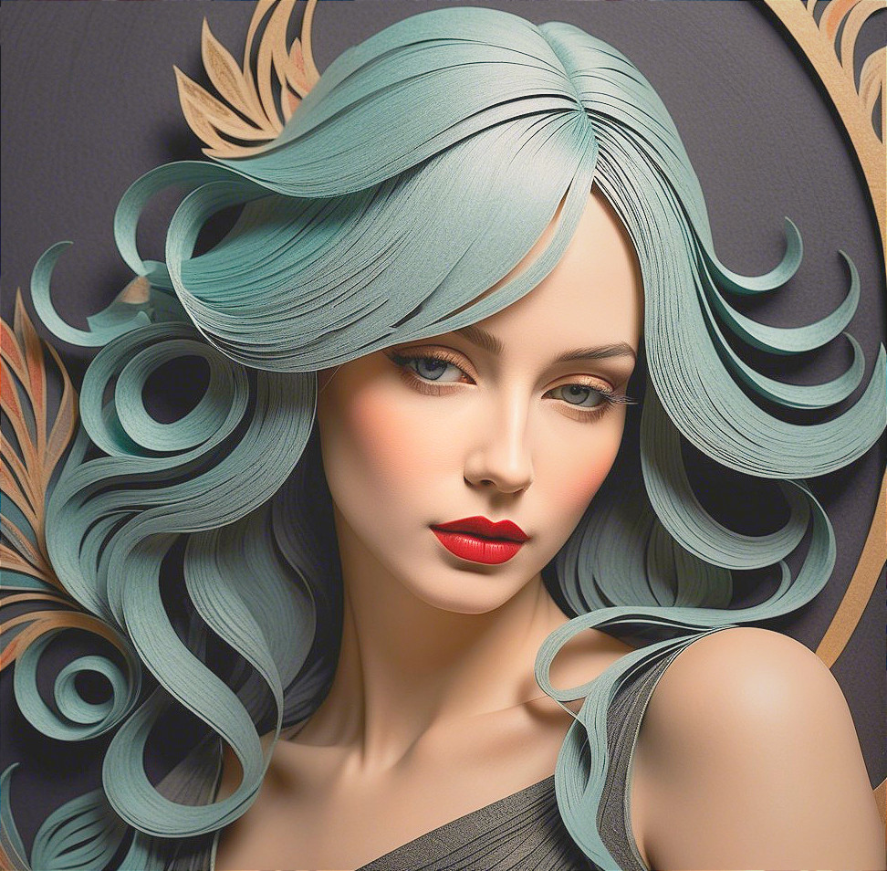 Prompt: A Renaissance portrait of a serene Gothic woman, textured with hatching details, cohesive fabric,distressed line work, Expired Film,modernist fashion aesthetic, upper body portrait, paper cut resembling the style of Ann Telnaes, full-width papercut, detailed scenery. Focus on creating an illusion of flowing hair with sculpted bas-relief effects, metallic colors, extremely colorful palette. Infuse foampunk elements for a dark Gothic twist, ensuring crisp quality and HDR enhancement at 64K resolution. Explore paper art techniques, hyes by Virgil Finlay, with a top-to-bottom view and romantic coherence. Subtle cohesive integration of:euclidean Geometry, origami as 3D textiles, defined deckle-edged handmade paper, light beams, cutting-edge technique for a textured appearance, integrating geometric shapes in a layered, tessellated manner,contrast between stippled details and gothical flair, cel-shaded fantastical setting. intricate linework, patchwork tessellation, American Gothic. Key integrations: Flowing Iridescent futuristic couture inspired by Iris Van Herpen, fractalization and raytraced shadows for depth, warm color palette of deep green, burnt red, and saturated tones, 3 layers of Iridescent holographic silk moire, surreal artwork, hyper-detailed graphic line art and painting of a willowy chic young woman,flowing textures & textiles are part of her form and the surroundings , a dimension that weaves a world where all elements are suspended. dynamic fluidity of form & function showcasing exquisitely designed fluid couture textiles, line & brushstroke art that is comprised of varied linear shapes including abstract pointillism & textured pointillism. Subtle cohesive integration of: Futuristic Geometry, origami as 3D textiles, golden ratio, Bloom-Effect, narural lighting, light-focused, vitreous, fantasy superrealism, atmospheric mist, dreamscape, hyperrealism, precise Gelsculpt 64K, parallax occlusion 1.2, raytraced shadows 1.8, sublime, stylization 1.3,