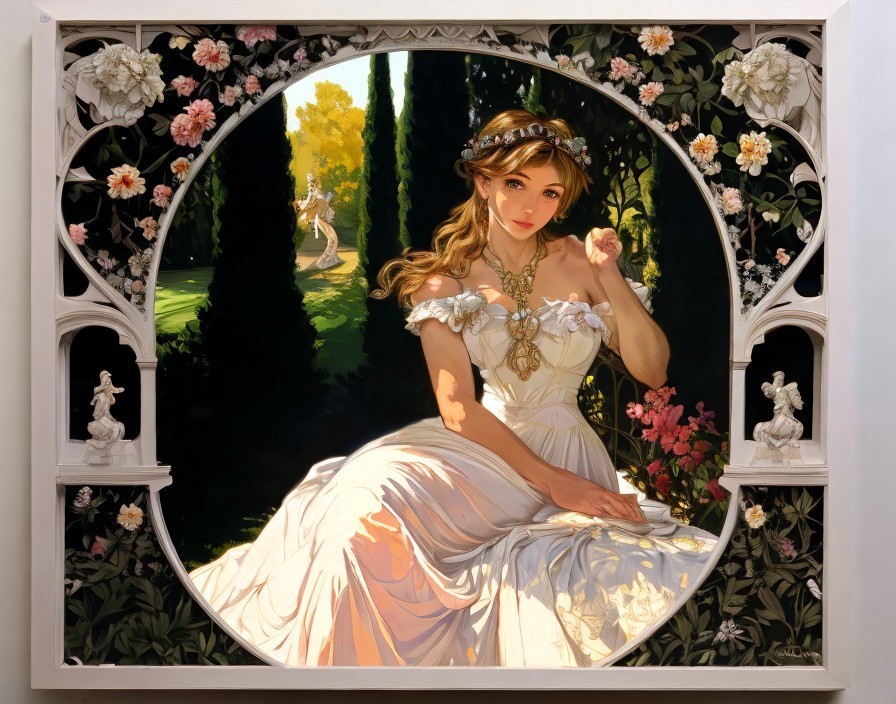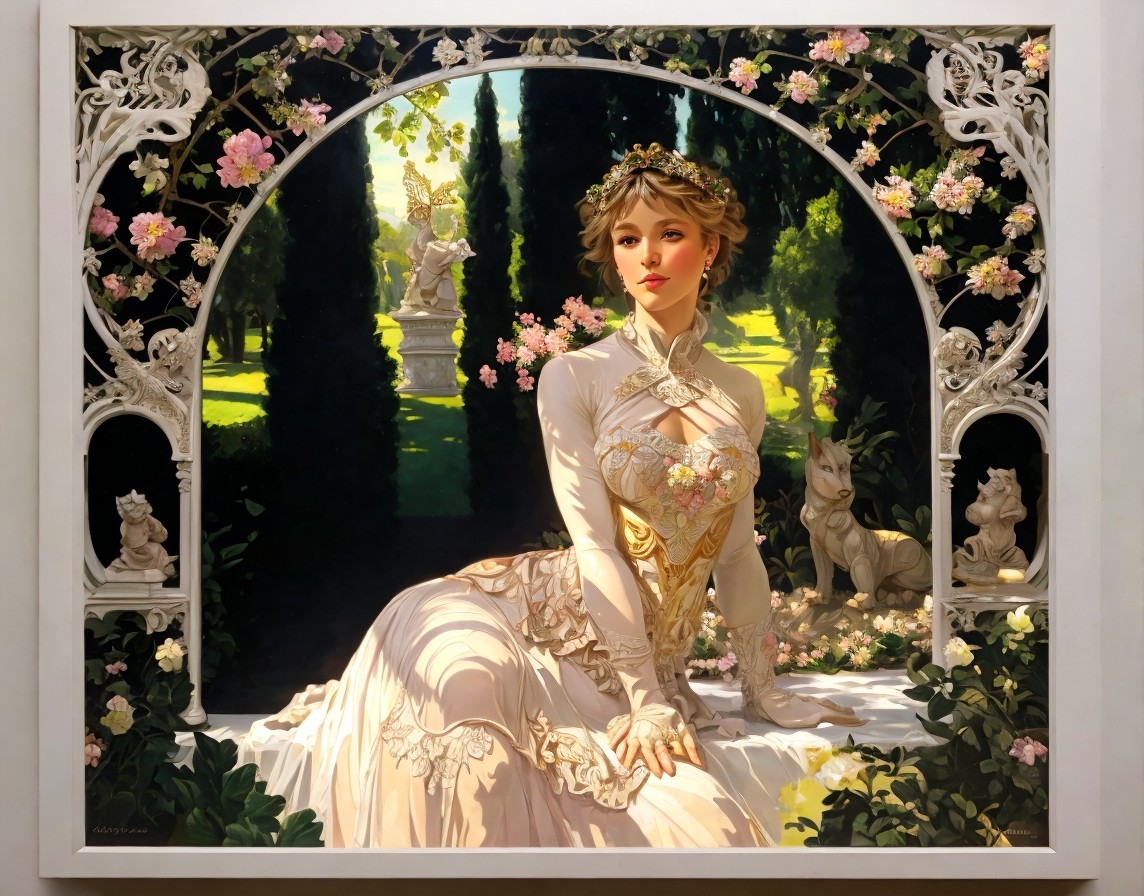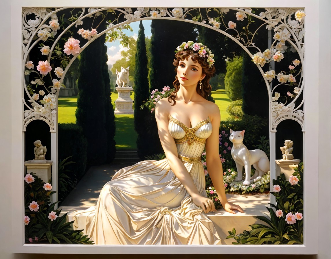 A woman sits in a garden in a villa, cat statues adorn the garden.