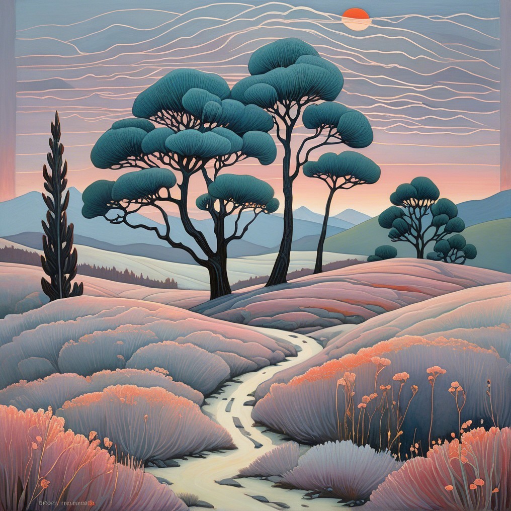 + Prompt:Botanical illustration featuring vintage tundra flora, muted greens, siberian landscape, sunrise, pale sun, red and orange sky, in the style of Maria Prymachenko, Meghan Duncanson and Odilon Redon, lichen, grasses, fine golden lines overlay by Troy Carney, detailed, intricate, distant mountains enveloped in blue fog, haze, naive style, focus on 3D textures. Cold and dreamy atmosphere.