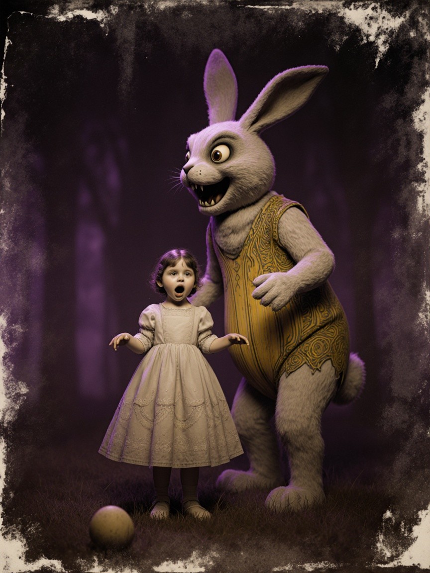Prompt: A sepia-toned retro photograph of a child in a vintage dress and a giant, slightly menacing Easter bunny costume, both with mouths agape in expressions of fright. The scene is bathed in soft, dim lighting, with worn, damaged edges to the photograph. This dark fantasy concept art, rendered in a hyperdetailed, intricately detailed style, evokes the splash screen art of Unreal Engine. Dynamic, volumetric lighting with deep color hues of purple and yellow create a dramatic, complementary color scheme. Inspired by the masterful brushwork and imaginative scope of Greg Rutkowski, Jordan Grimmer, and the elegant Art Nouveau lines of Alphonse Mucha, this 8k resolution masterpiece embodies the flux style, trending on Artstation.