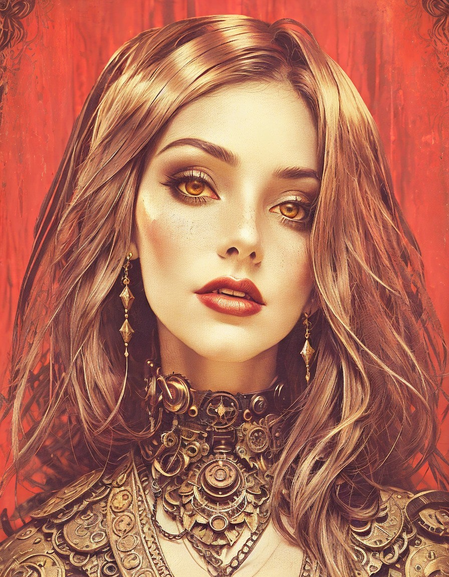 Prompt: Fantasy porrtraiture, upper bidy portrait, stacked-up perspective, charcoal textures, stylized illustration, fine strokes, mixed media, modern art, anthotype print, beautiful temptress with demonic eyes, steampunk, dark fantasy art inspired. rusted metal armor with brass details, halos, aura, golden ratio, dreamy and ethereal, complexion 1.4, triadic color scheme beige ochre red, psychedelic, intricate art by bastien lecouffe deharme and Margaret Keane, rusted metal details, corrosion, 3d effects 1.8, ambient occlusion 1.2, anisotropic filtering 1.7, raytraced shadows 1.8, sublime, eldritch, occult, american gothic 1.7, anglo gothic 1.2, radiance, maximalism, bioluminescent, psychpomp,quaint, quilling, folded paper style 1.6, encaustic streaks, dauvism, delicate coloring, advertising art style, tints of movie poster art merged with marvel comic book art, beautiful artwork, stylized illustration 1.5, vaporous lighting from top to centre, diffused lighting 1.7 brightness 1.4,
