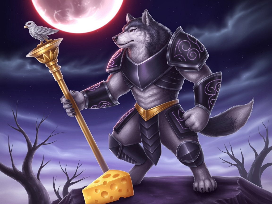 Prompt: A fantastical humanoid figure with the head of a wolf stands tall, wearing ornate black and gold armor embellished with intricate designs. In one hand, it proudly holds a scepter topped with a bird, while a red moon looms ominously in the sky behind it. The setting features a small rocky island surrounded by barren soil, with a few sparse trees and a piece of gold lying on the ground, all rendered in a vibrant, illustrative style. The overall atmosphere is both mystical and eerie.