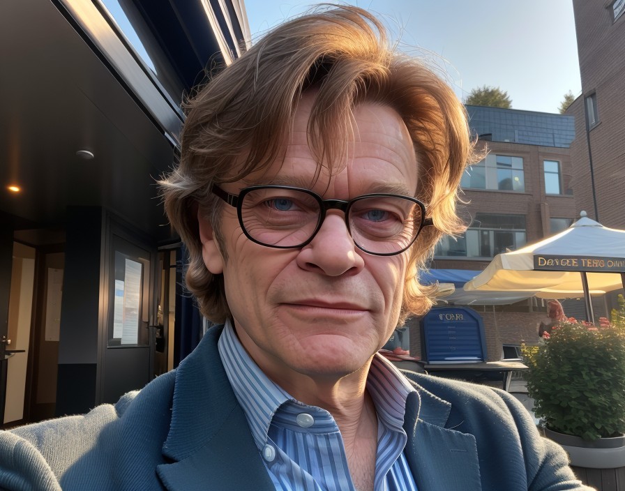 A person with glasses is holding a blue sonic screwdriver towards the camera on a city street during the evening.