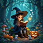 A young witch with elongated ears sits on a log, reading a book in a magical forest. Surrounded by pumpkins, mushrooms, and cute animals, she glows with enchantment as autumn leaves fall.