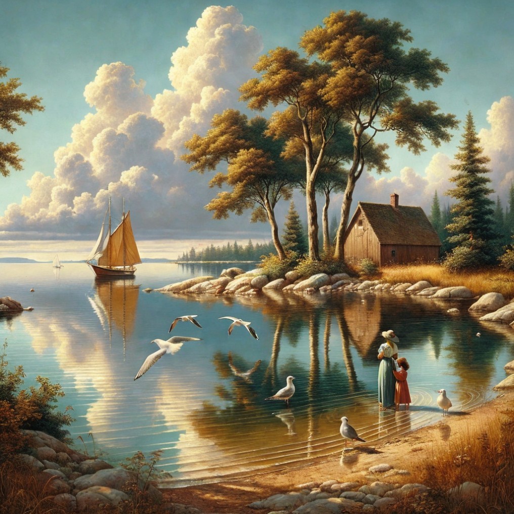 A serene lakeside scene features a cozy cottage amid lush trees, with children by the water's edge. A sailboat glides past, while birds gracefully fly over the calm, reflective surface.