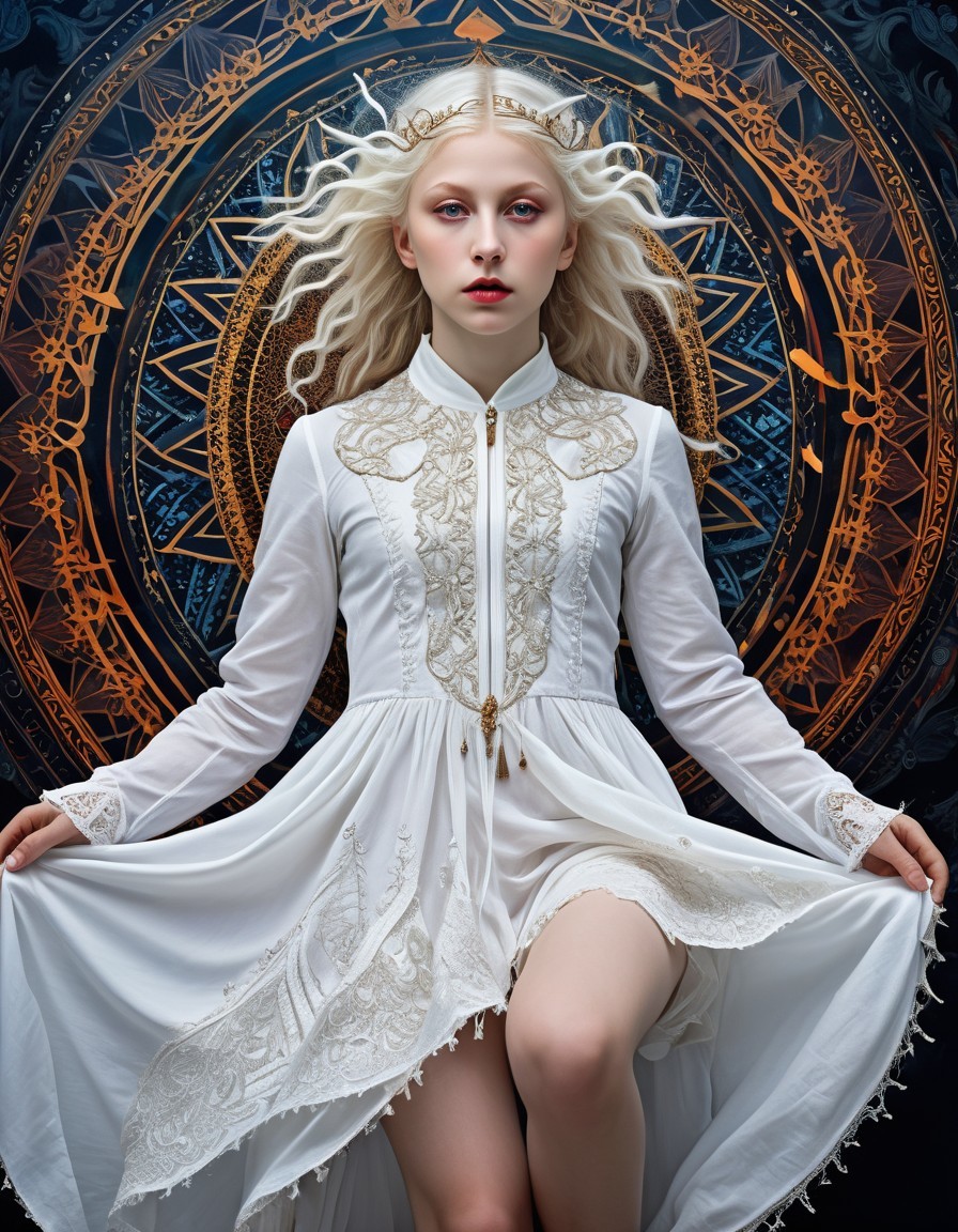 A young woman in a flowing white dress sits gracefully against a richly detailed circular backdrop, exuding a mystical and ethereal aura with her flowing hair and serene expression.