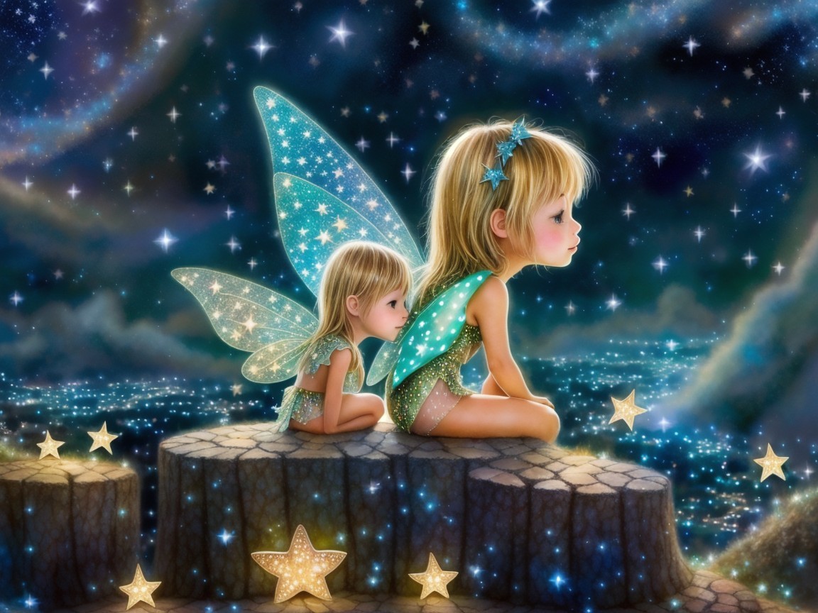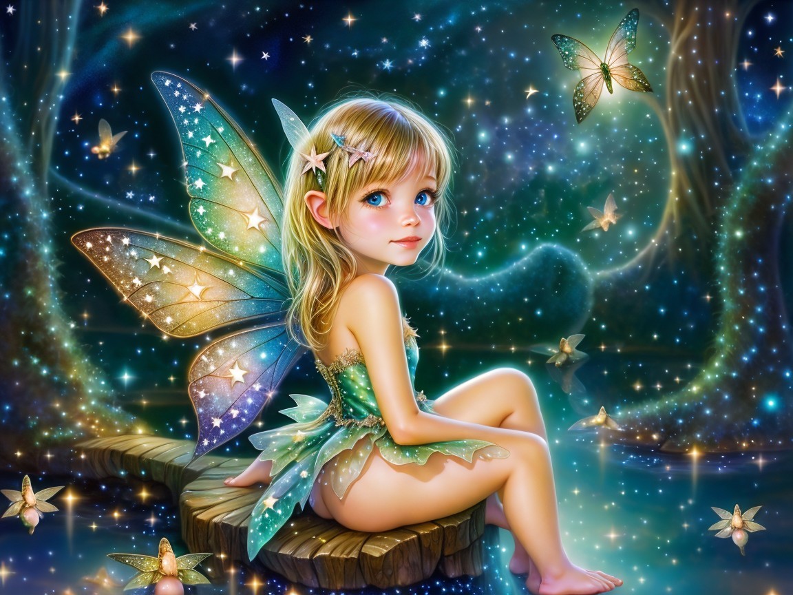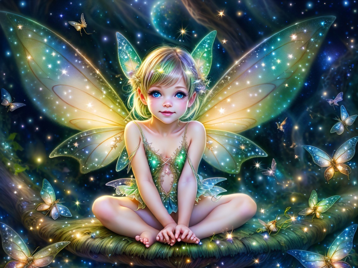 A whimsical fairy sits on a mossy rock, surrounded by shimmering butterflies. With sparkling green wings and a enchanting smile, she emanates a magical glow in a mystical forest.