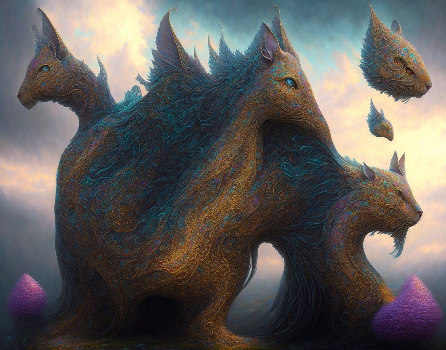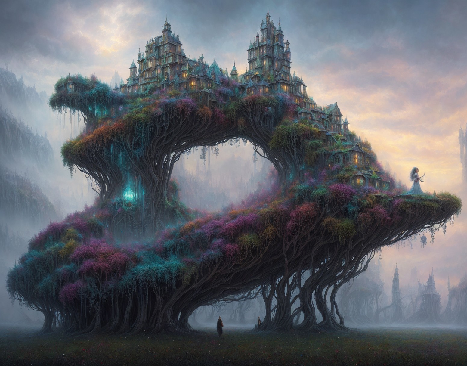 A fantastical image depicts a surreal, floating island with a mansion atop, surrounded by mist and figures observing below.