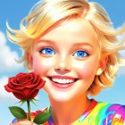Prompt: IT'S A VERY SUNNY DAY! Against the background of a Large golden cross and moving waves, there is a charmingly smiling angel girl with a very beautiful face dressed in dazzling armor made of mirrored gold that reflect the surrounding light, the angel girl has an extraordinarily beautiful face and very large, radiant sky-blue eyes filled with love and joy. Smiling with joy and happiness, the girl is an angel.he goes forward, offering the viewer a beautiful, big, bright, sunny heart from which the sun's rays fly. A great fire descends upon her from a large golden cross! Her gaze radiates happiness and strength. She is very beautiful and smiles joyfully, filled with excitement! Her skin is radiant and sunny, and she has a delicate blush on her cheeks. Her short, sunny, stylish, and ultra-modern hair shimmers with golden rays, and a bright, shining halo surrounds her head, giving her an aura of holiness! She smiling very beautiful stands gracefully on a bridge made of pure light, the clouds. The bridge glows brightly and leads to a mirrored golden gate that rises into the sky, with a large golden cross shining above it, emitting light. Red roses bloom in the foreground. A gentle breeze lifts the glowing rose petals into the air. The sky is with soft clouds and sunlight. An airy, ultra-detailed, cinematic portrait with 2K resolution.