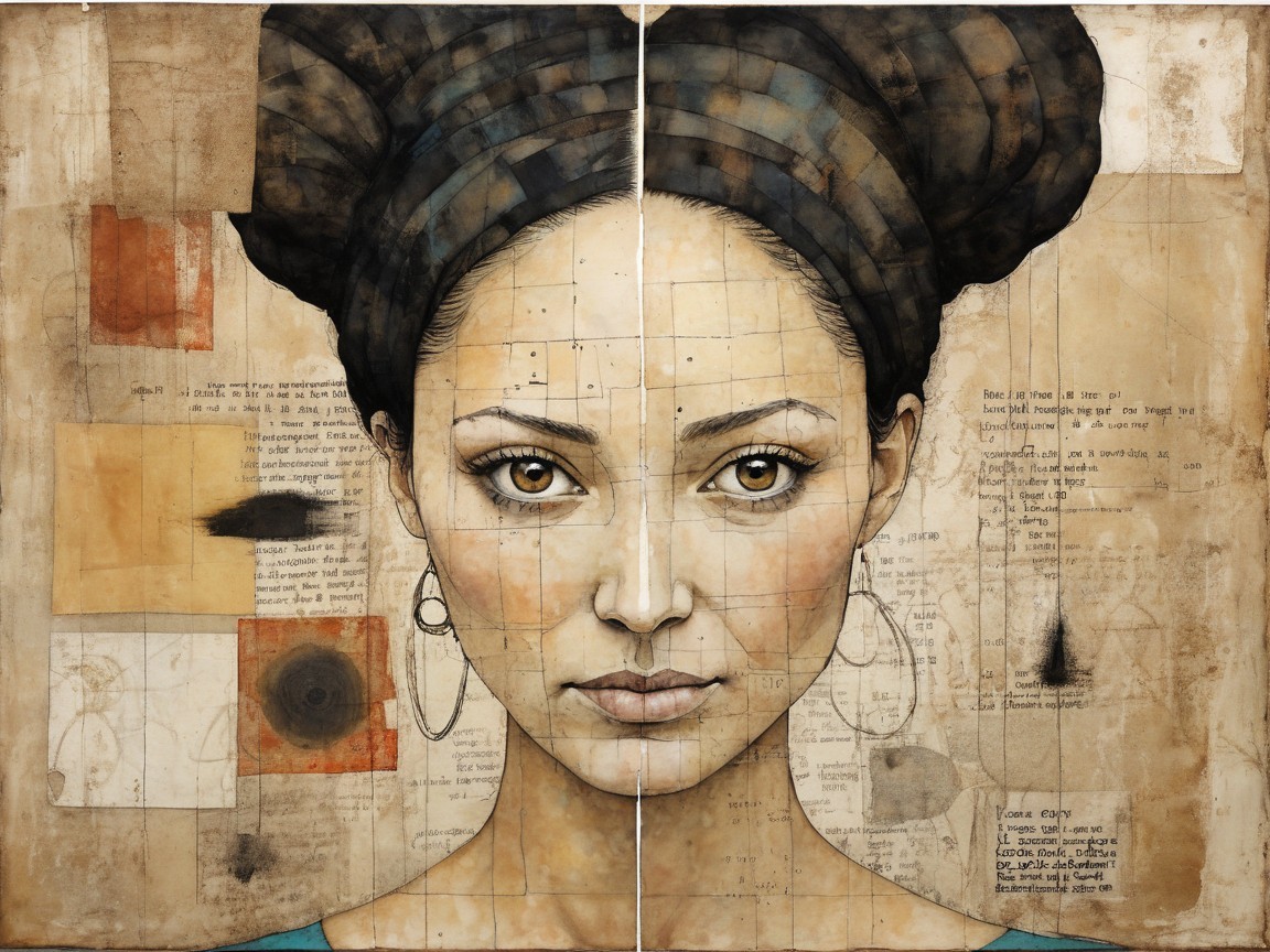 A serene, ethereal portrait of a young woman adorned with intricate patterns and cosmic orbs, blending natural beauty with a surreal, otherworldly aesthetic. The colors are soft and harmonious.