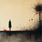 A solitary figure stands on a stark landscape, flanked by a bare tree and an abstract burst of color. The background blends warm and cool tones, creating a sense of introspection and contrast.