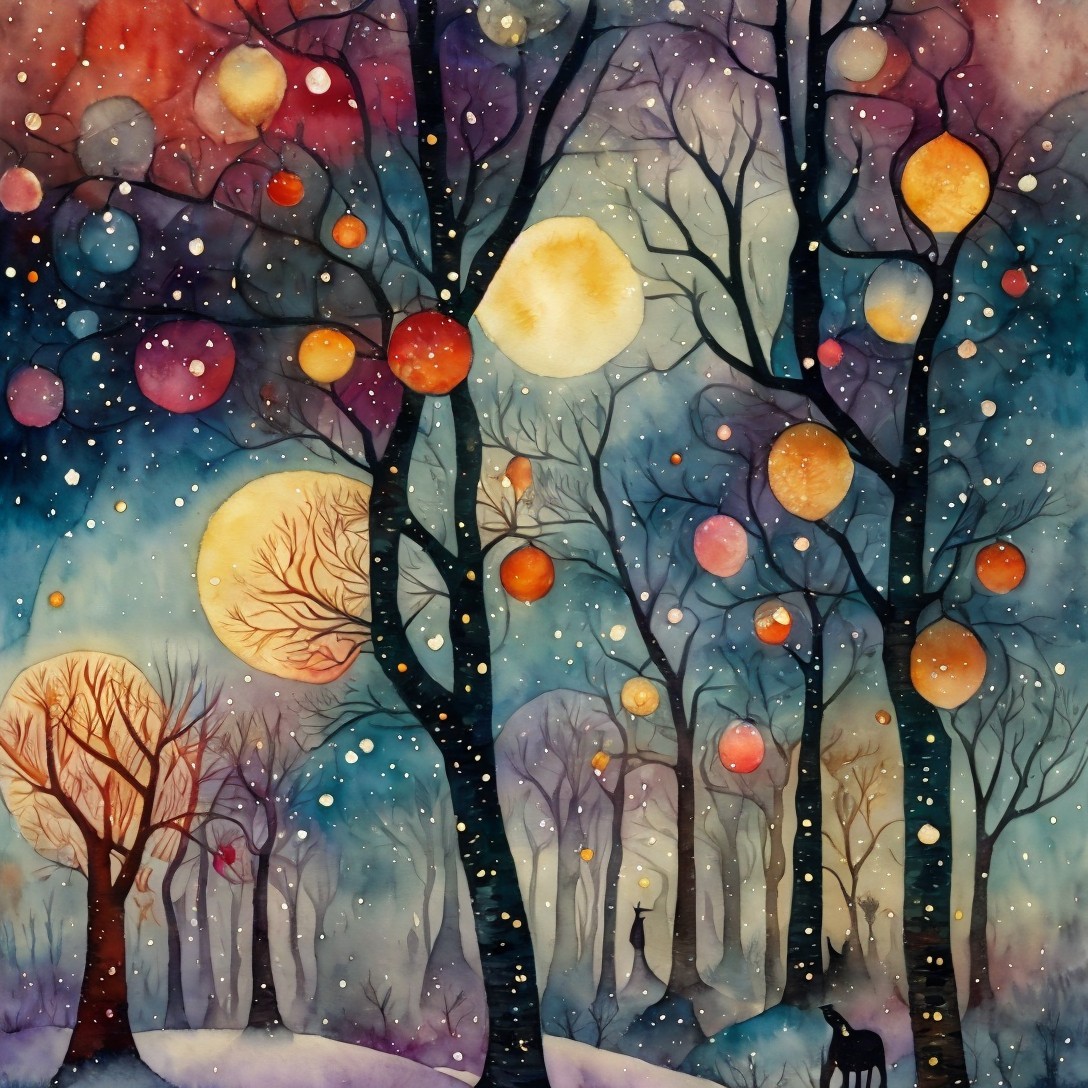 Beautiful winter trees, elegant, fantasy, intricate, very attractive, beautiful, watercolor, mystic, Paul Klee, art deco, Tim Burton, Yacek Yerka, Deep, Dee Nickerson, Van Gogh, funkelnd, very deep, glitzernder schnee, spirit in the sky.