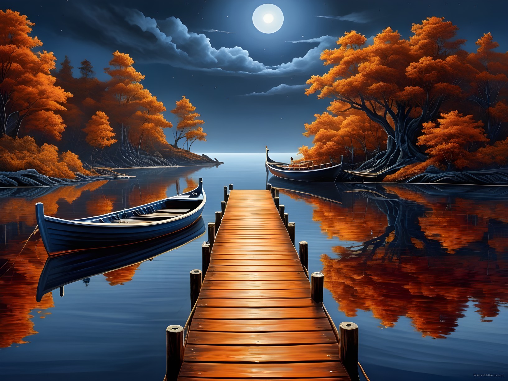 A serene night scene features two boats at a wooden dock, surrounded by vibrant autumn trees. A full moon illuminates the calm water, reflecting the beauty of nature and the peaceful atmosphere.