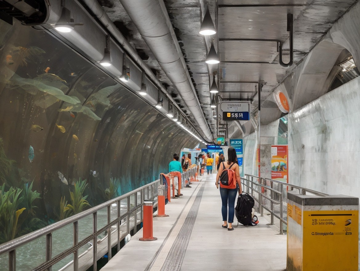 A vibrant subway station with an underwater theme, featuring a large aquarium-style wall mural, green pillars, and a clean platform.