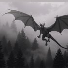 A majestic dragon soars above a dense, misty forest. Its massive wings stretch wide as it glides through the fog, creating an ominous yet captivating presence amidst the dark silhouettes of trees.