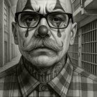 A close-up portrait of a man with a bald head, thick glasses, and a prominent mustache. His expression is serious, set against a slightly blurred industrial background. The lighting adds depth to his features.