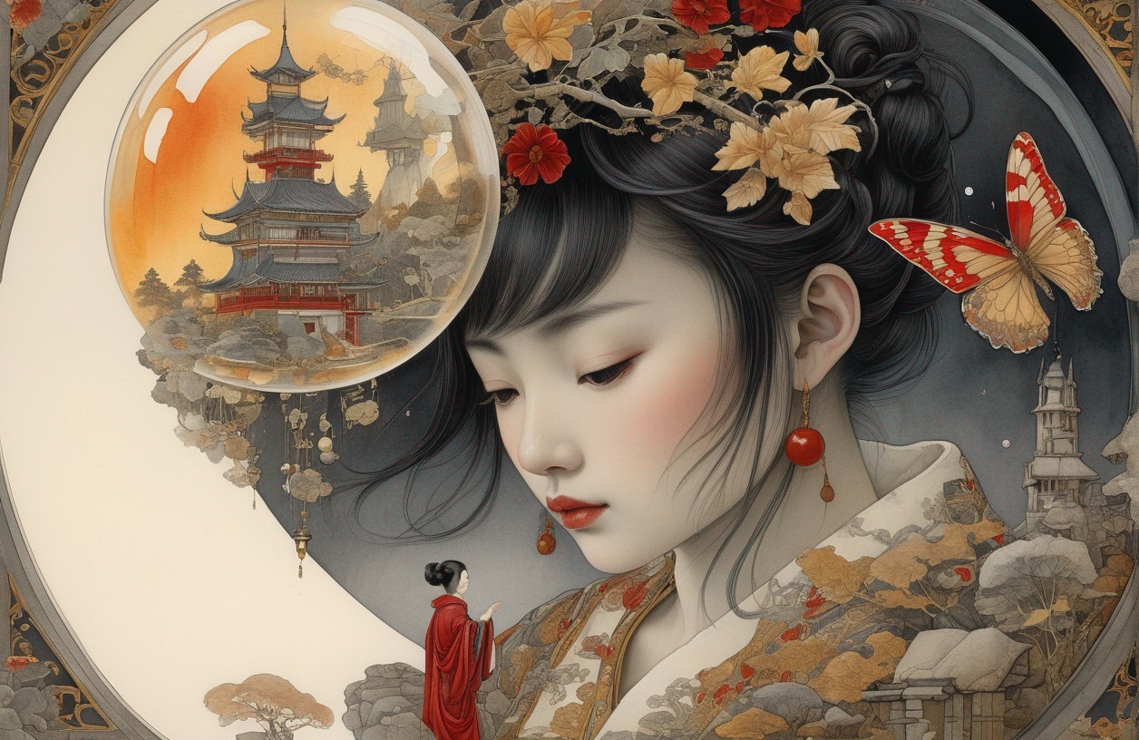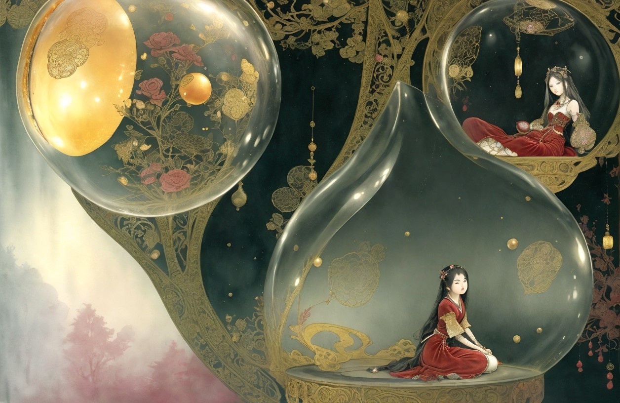 Beauty girl in a bubble,, Medieval Japanese Artists Sumi-e Style, choral, Ruby red, Velvet Black, Shabby, Dull Gold, Amber Gray, Golden Ratio, Surreal Fantasy, Elegant, High Definition Ultra Fine 3D Line, Zenangle Style, Watercolor Patchwork , Arthur Rackham Style, Paul Kidby, , Jacek yerka, Extremely Detailed, Intricate, Thoughtful, HDR, Fractal, Beautiful, Award Winning, Fantasy Look, Fantasy, Crisp Quality