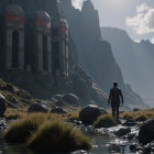 A lone figure stands in a rugged landscape, surrounded by towering mountains and rocky terrain. Three futuristic structures rise in the background, hinting at an otherworldly setting.