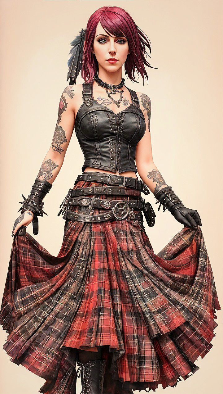 Punk rock female with kilt, beautiful face, quilling, watercolor and ink painting 1.7, gothical background 1.8, 3d effects 1.8, shadow mapping 1.3, sttlized painting, comical concept art, mystical fantasy art, dynamic lighting 1.7, raytraced shadows 1.8, sublime, eldritch, occult, cottagegore 1.9, retrofuturistic background, anisotropic filtering 1.7, raytraced shadows 1.8, dethereal details, erotic essence, 1970s movie poster art, intricate ornamental details, gothic, psychedelic, maximalism, biomorphic details, steampunk illustration,ghostly, eldritch, occult, triadic color scheme red black beige, detailed steampunk features, devilish eyes 1.7, radiance, highly detailed composition 1.9, rim lighting, golden ratio, crackles, contraptions, detailed hairdo, blurry aura, soft edges, back-lit,