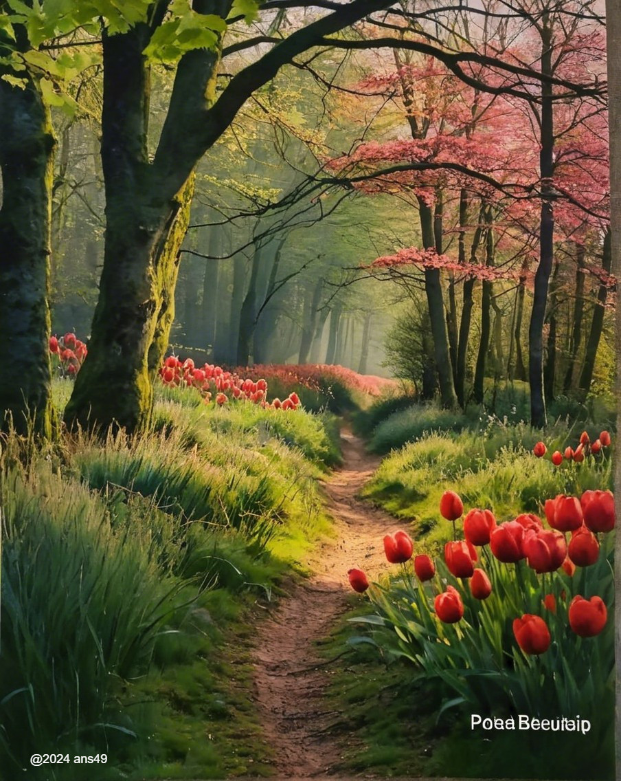 A serene pathway winds through a lush forest, lined with vibrant red tulips and bathed in soft morning light, surrounded by green trees and hints of spring foliage.