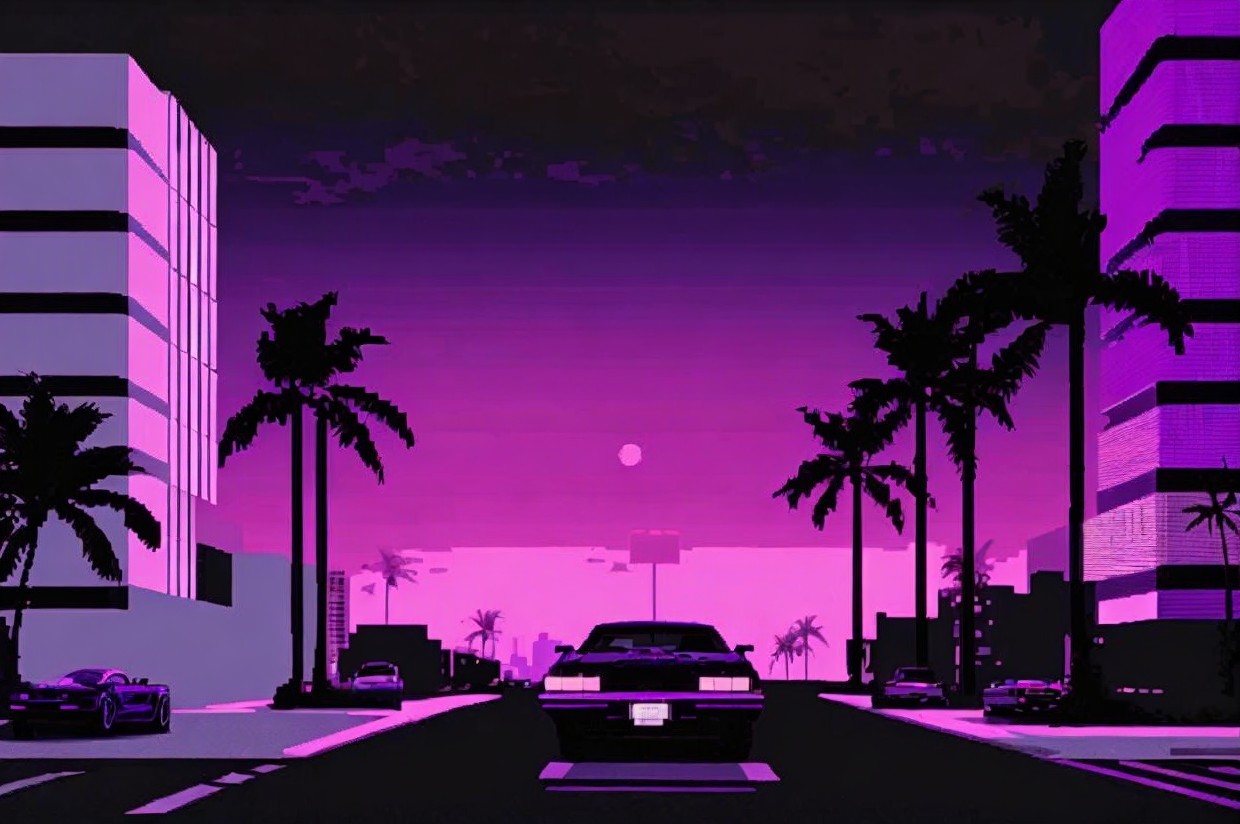 A stylized image of a car on a city street at sunset with pink-purple hues and silhouetted buildings.