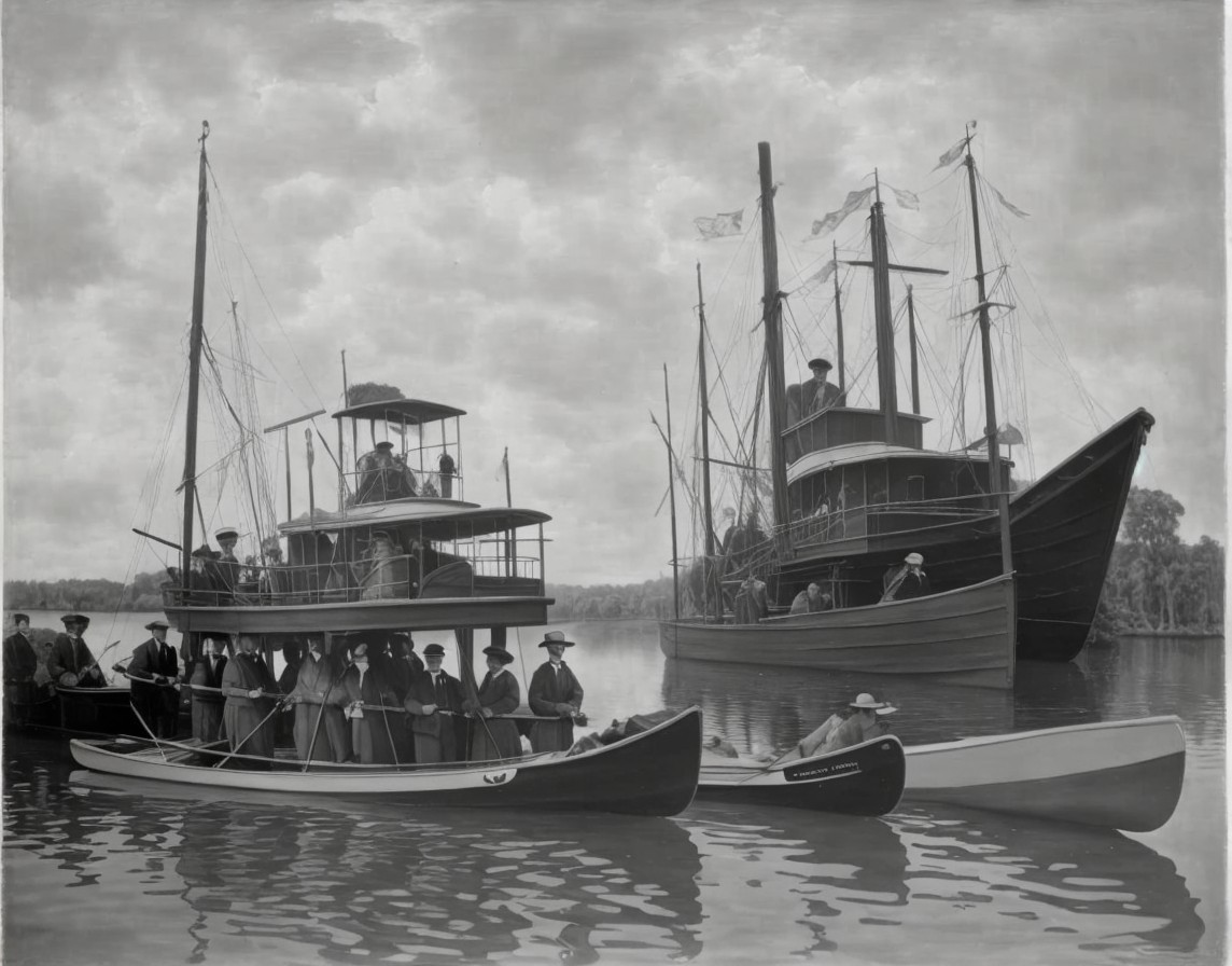 Monochrome painting of people on steamboat and rowboats on calm lake