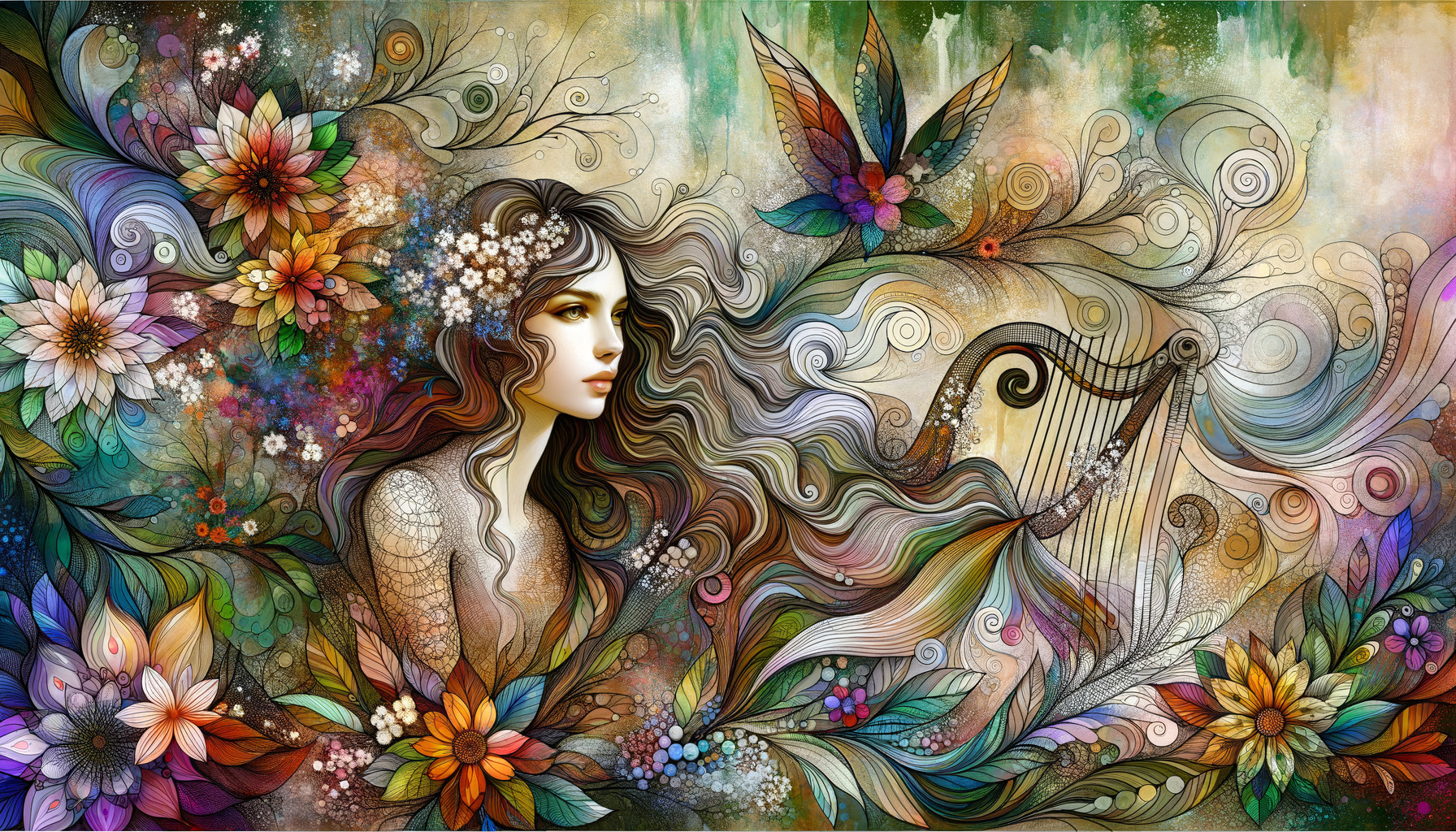 Prompt: "Lively blooming trees, vibrant flowers, intricate wire details, alcohol ink swirls, acrylic watercolour blend, whimsical nature art, pale green blotched canvas, detailed floral patterns, colorful foliage, dynamic composition, organic shapes, mixed media masterpiece, high detail, vivid colour palette, intricate wire work, textured surface, fantasy botanical elements. Flowing brunette hair like silk, hazel eyes shimmering, large gossamer wings intricate, detailed harp with mystical touch, porcelain skin glowing, tall as a faerie, dreamy setting, dark abstract background, magical aura, warm gold tones, dark purples, sketch, digital painting fusion, unique style, delicate line work, soft shading, ethereal, captivating, EmmAI mood."