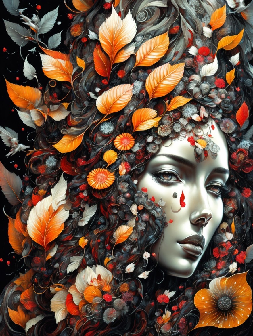 The image features five women in striking coats of red and white, surrounded by vibrant autumn leaves. Their poses convey elegance and unity against a richly detailed backdrop.