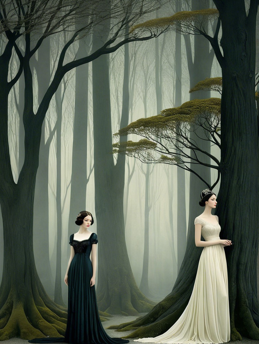 A serene, starry night scene features a woman in a black dress standing by a calm lake, surrounded by tall, bare trees. A glowing full moon illuminates a quaint house nearby, creating a tranquil atmosphere.