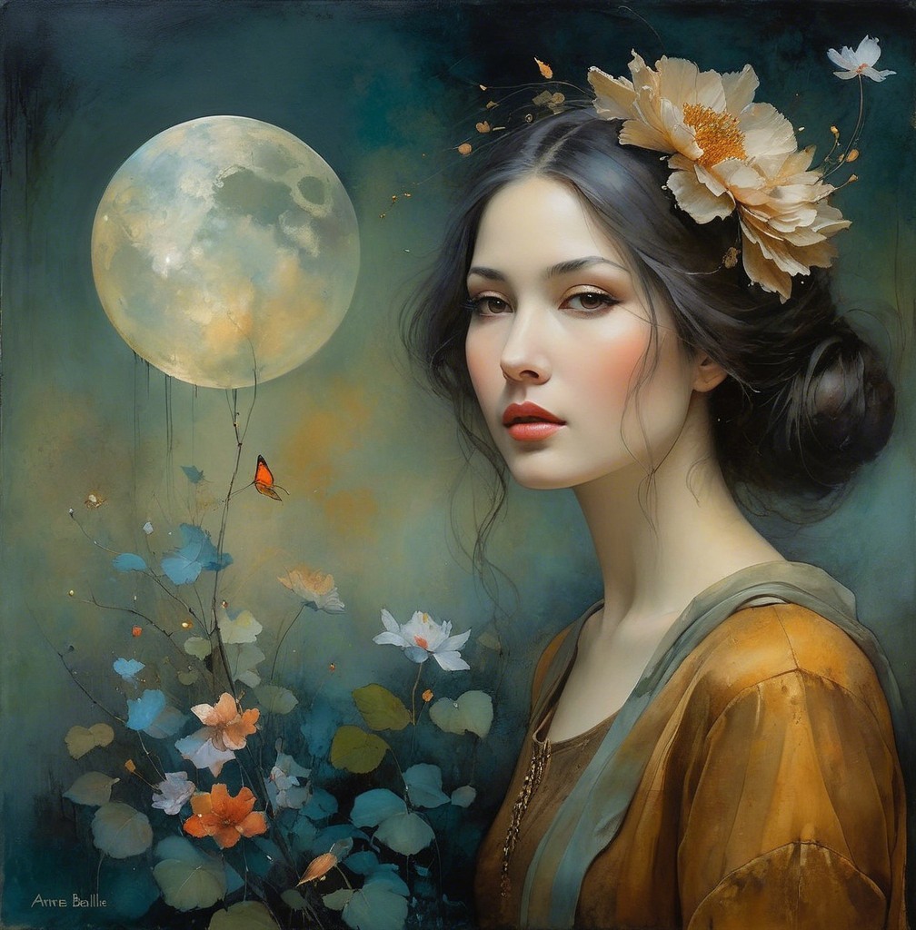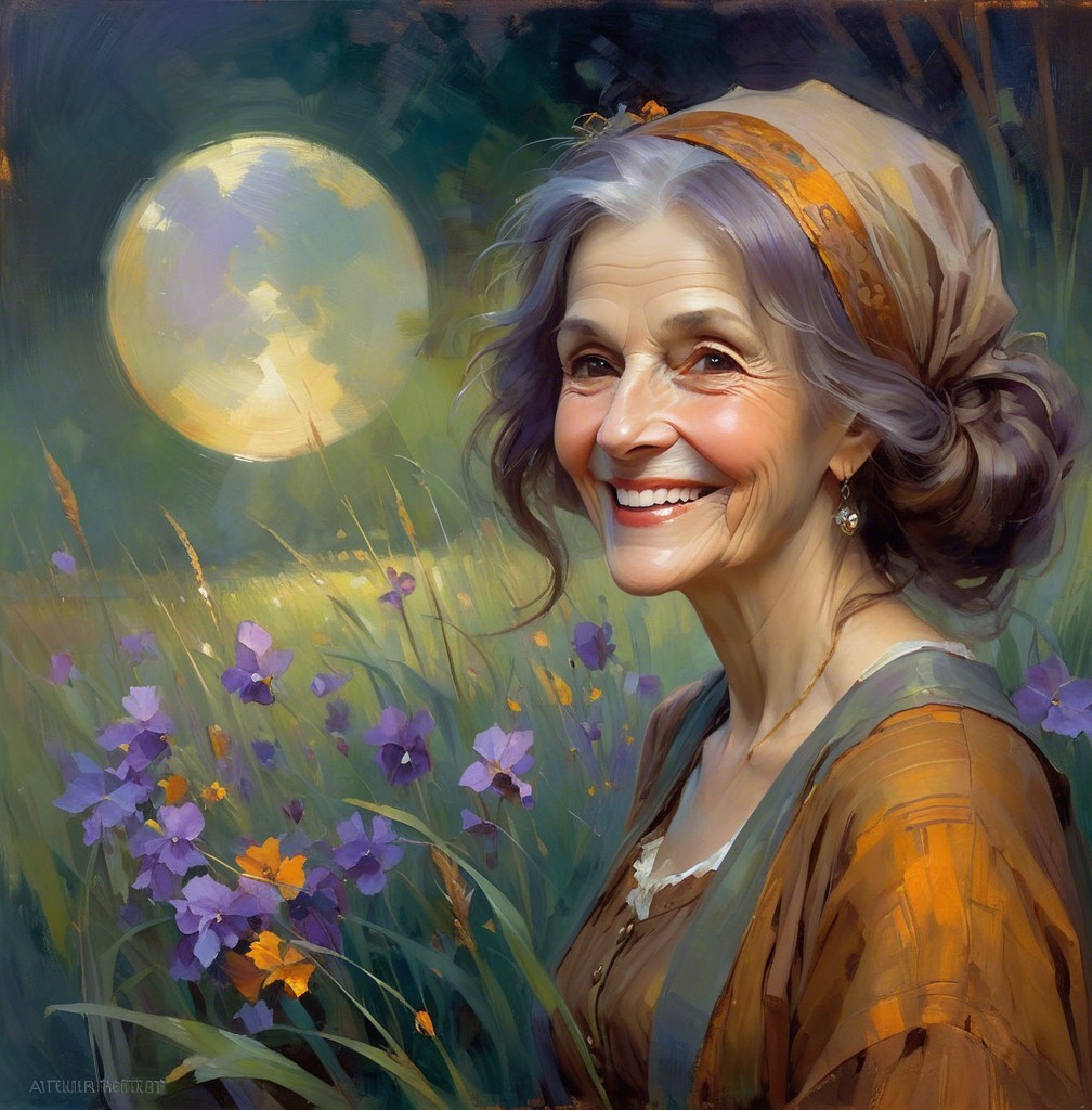 A joyful elderly woman with a serene smile, adorned with colorful fabrics and leaves in her hair, embodies nature’s beauty against a lush green background, radiating warmth and wisdom.