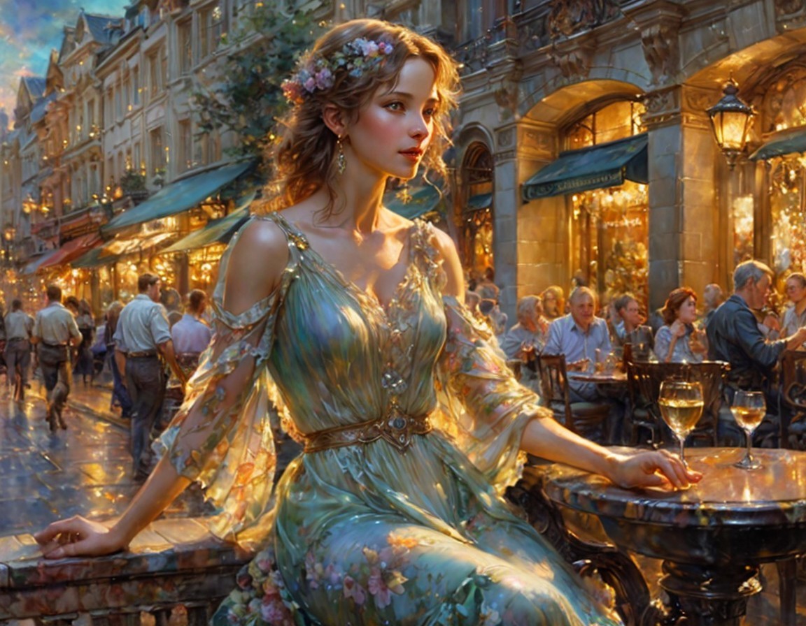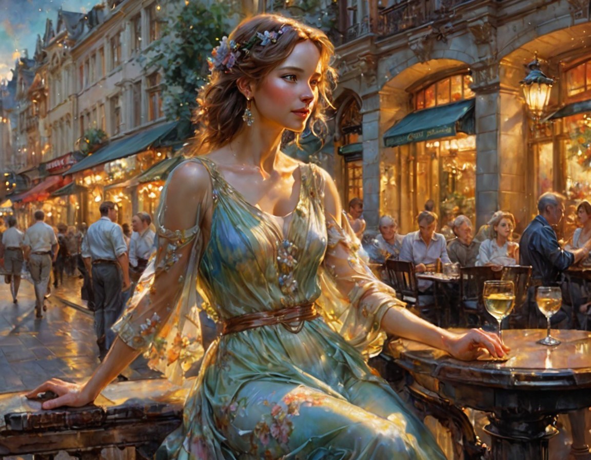in style Daniel Gerhartz: Beautiful Lady in the evening in the summer city, watercolor in pastel colors, clearly worked out details, high resolution, gentle radiance, high definition, high detail elaboration, high resolution, Hyper detailed, light reflections, refined, Sunshine rays, ultra-clear image, ultra-confusing, ultra-pronounced detail