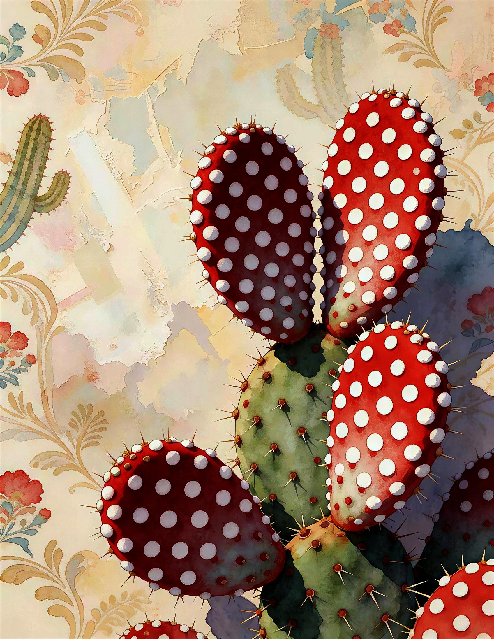 A digital illustration in a watercolor painting style shows a close-up, top-down view of six red pads of a prickly pear cactus with white polka dots and sharp brown thorns. The red pads are positioned among six green pads with brown thorns in the bottom and middle sections of the image. The pads
