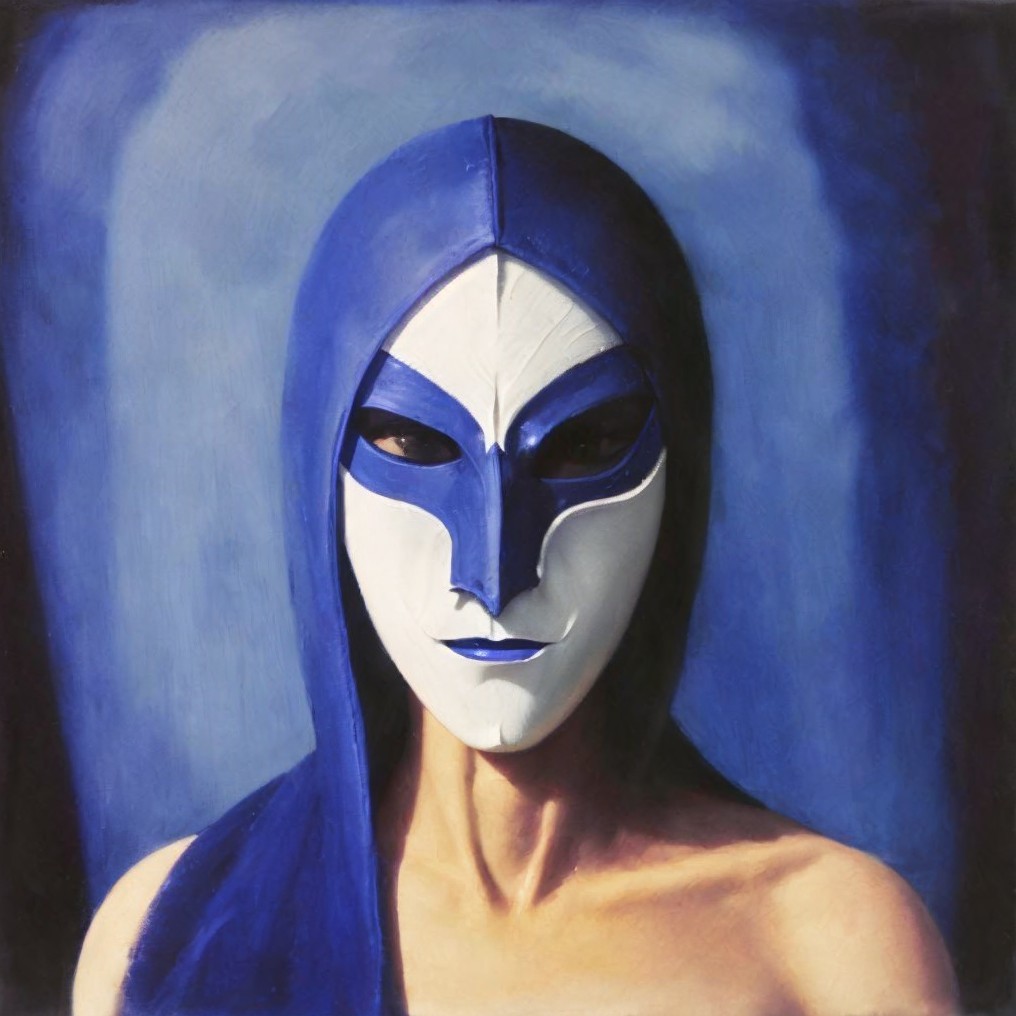 Prompt: A portrait of a mysterious figure wearing a stylized, blue and white mask. Moody atmosphere. The figure's shoulders are bare, highlighting the contrast between the mask and the skin. The lighting casts soft shadows on the face, accentuating the mask's angular design and the figure's prominent cheekbones.