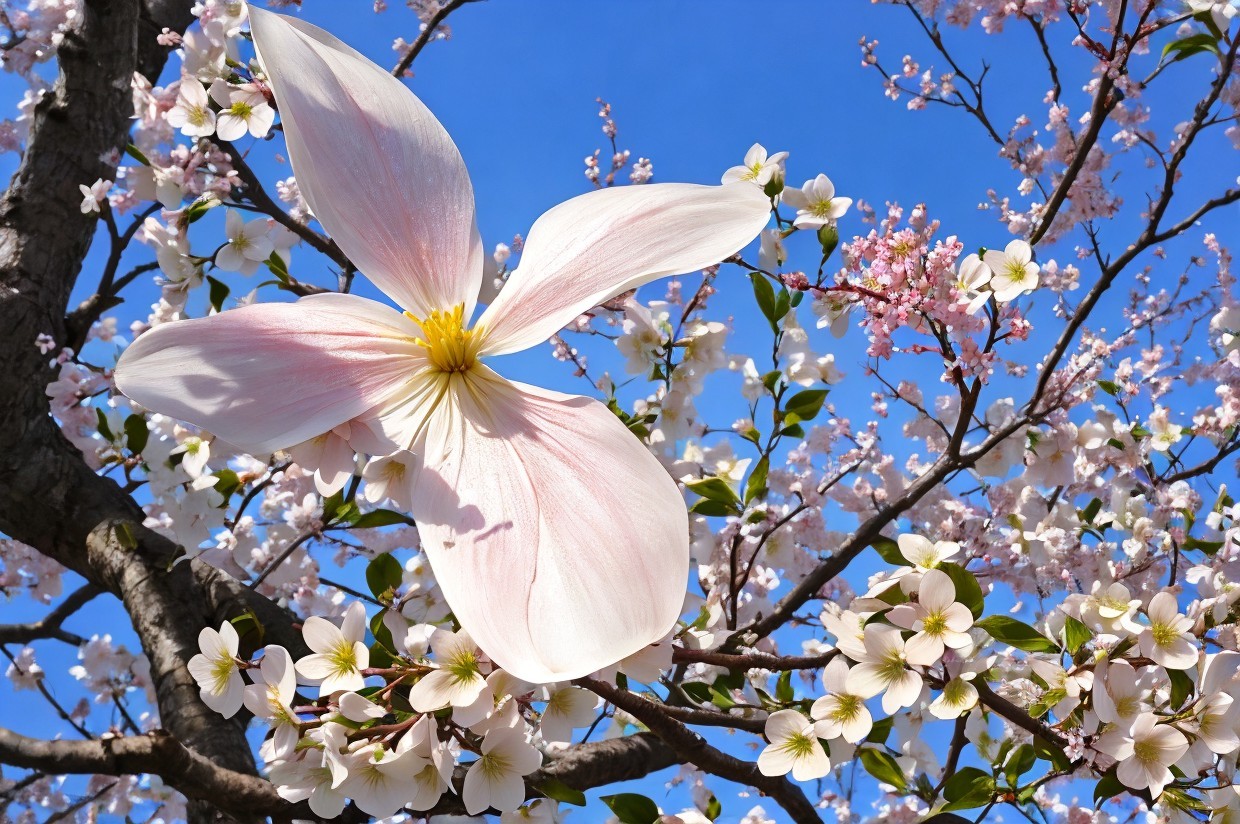 A tree with delicate pink-white blossoms against a bright blue sky.