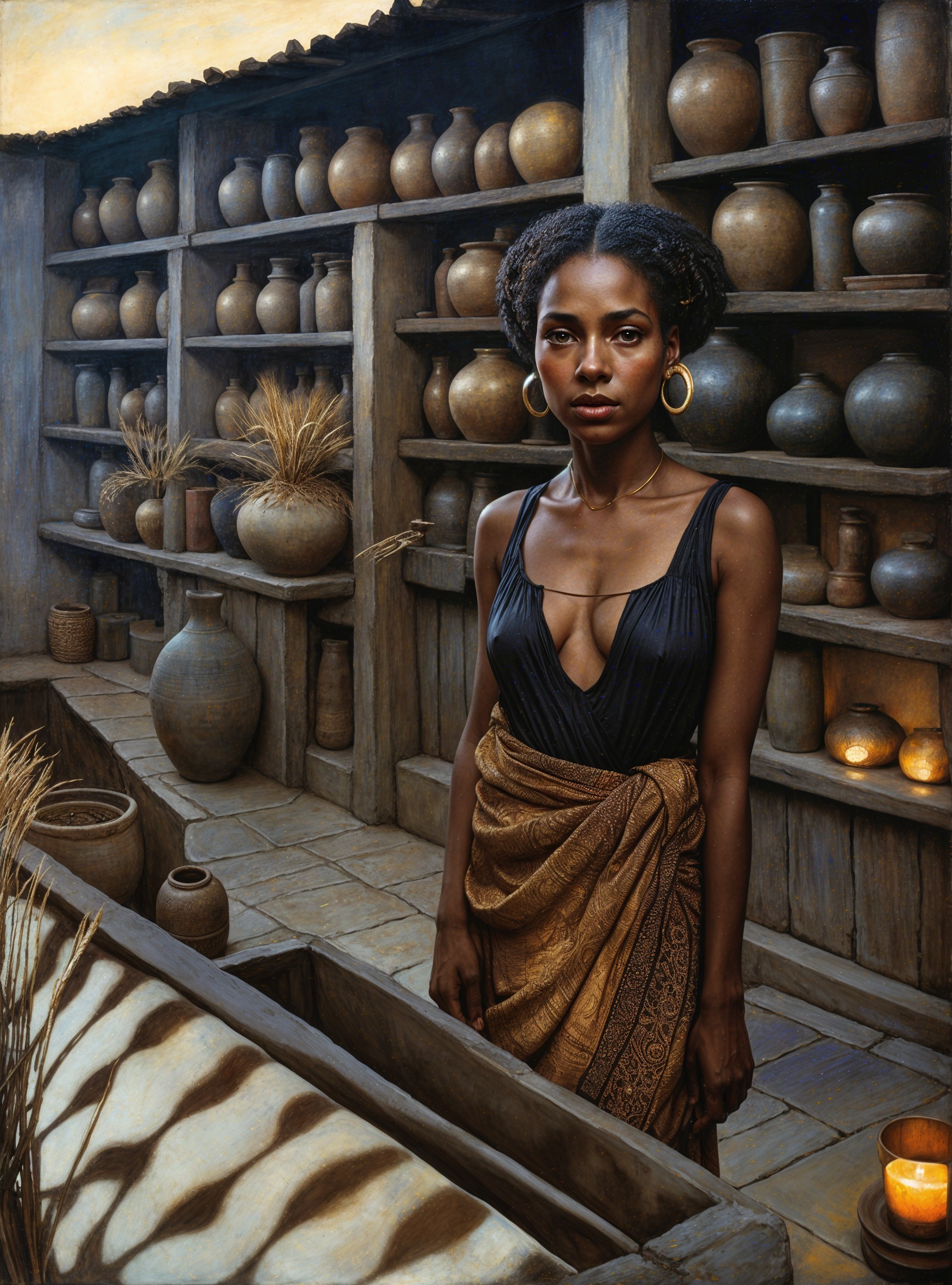 A young woman stands in an earthy, dimly lit space surrounded by ancient pottery. She wears a simple black top and a brown wrap skirt, radiating a timeless elegance amidst the rustic setting.