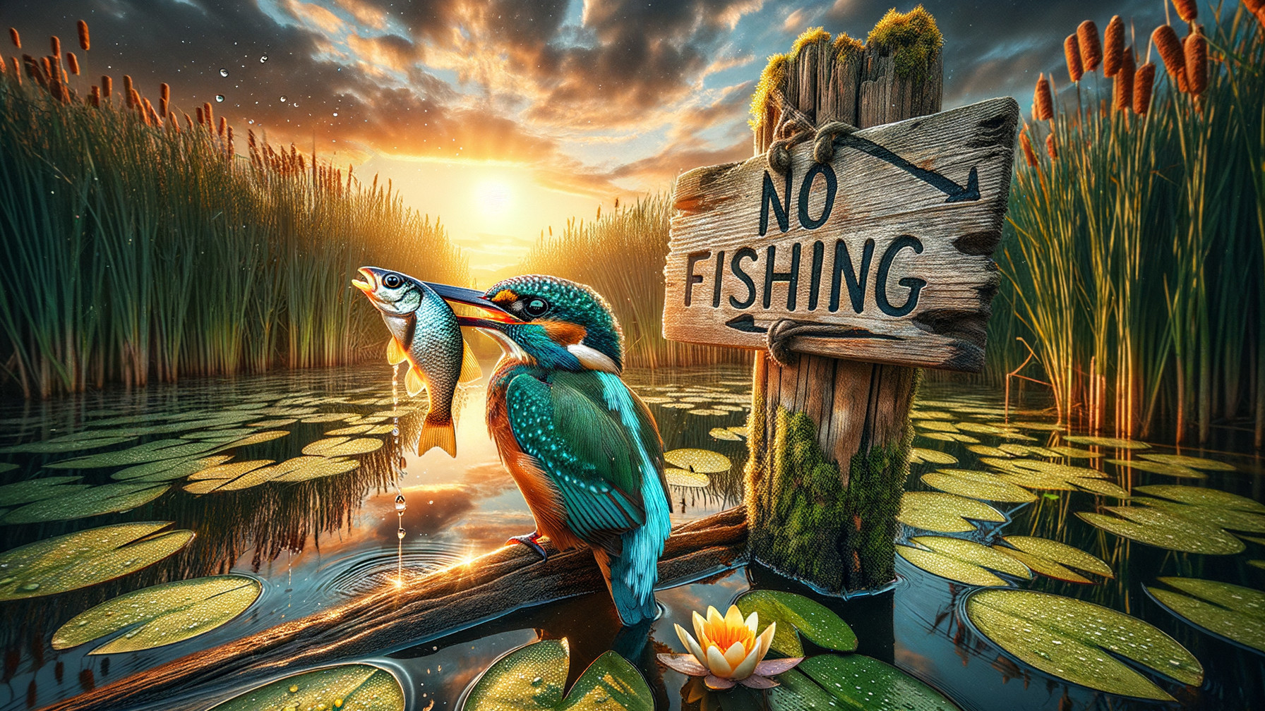 ACCENT/FOCUS: "The main character, the kingfisher is depicted in a medium shot, fully visible, within the frame of the image and slightly recessed into the depth of the scene." A vibrant, detailed kingfisher with blue-green feathers and a rufous belly, holding a fish in its beak, perches on an old wooden post with a "No Fishing" sign. The kingfisher is centered, looking up as water drips off the fish. The wooden sign, carved and cracked, looks very old and atmospheric, with an arrow and the words "No Fishing" in an ornate font. Surrounding the kingfisher and the sign are dense thickets of reeds and bulrushes, illuminated by the soft golden light of the setting sun. The water's surface is rippled, reflecting the orange sky and sun. Green lily pads and a single open yellow water lily float on the water, adding a natural and beautiful touch. The setting sun is visible over the horizon, creating a feeling of warmth and tranquility. The clouds in the sky are painted in soft orange and pink tones, adding drama and depth. The sun is partially hidden behind the horizon and vegetation, its rays filtering through the reeds, creating a play of light and shadow. The image is executed in the style of romantic realism, impressionism, and hyperrealism, with elements of digital painting. Inspired by the works of Alphonse Mucha and Karl Bryullov, with references to the realistic animation of Pixar. The medium shot, a close-up from eye level, is shot from a slightly lower angle, emphasizing the bird's monumentality. A deep depth of field with soft bokeh in the background is used to accentuate the kingfisher and the sign. The artistic treatment of light and shadow is characterized by a warm, golden sunset light, creating long shadows and bright highlights on the water and the bird's feathers, with the effect of diffused light through the vegetation. Color palette: bright orange, golden yellow, turquoise, deep blue (in the kingfisher's feathers), green (vegetation), brown (wood). The scene's atmosphere is calm, serene, poetic, slightly ironic, and melancholic. Technical specifications: high-quality 3D rendering, Unreal Engine 5, Octane Render, 8K resolution, ray tracing, global illumination, HDR. ArtStation Masterpiece.